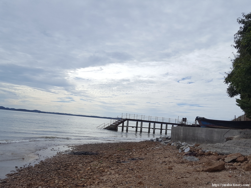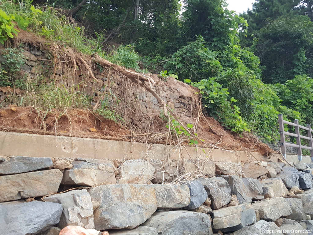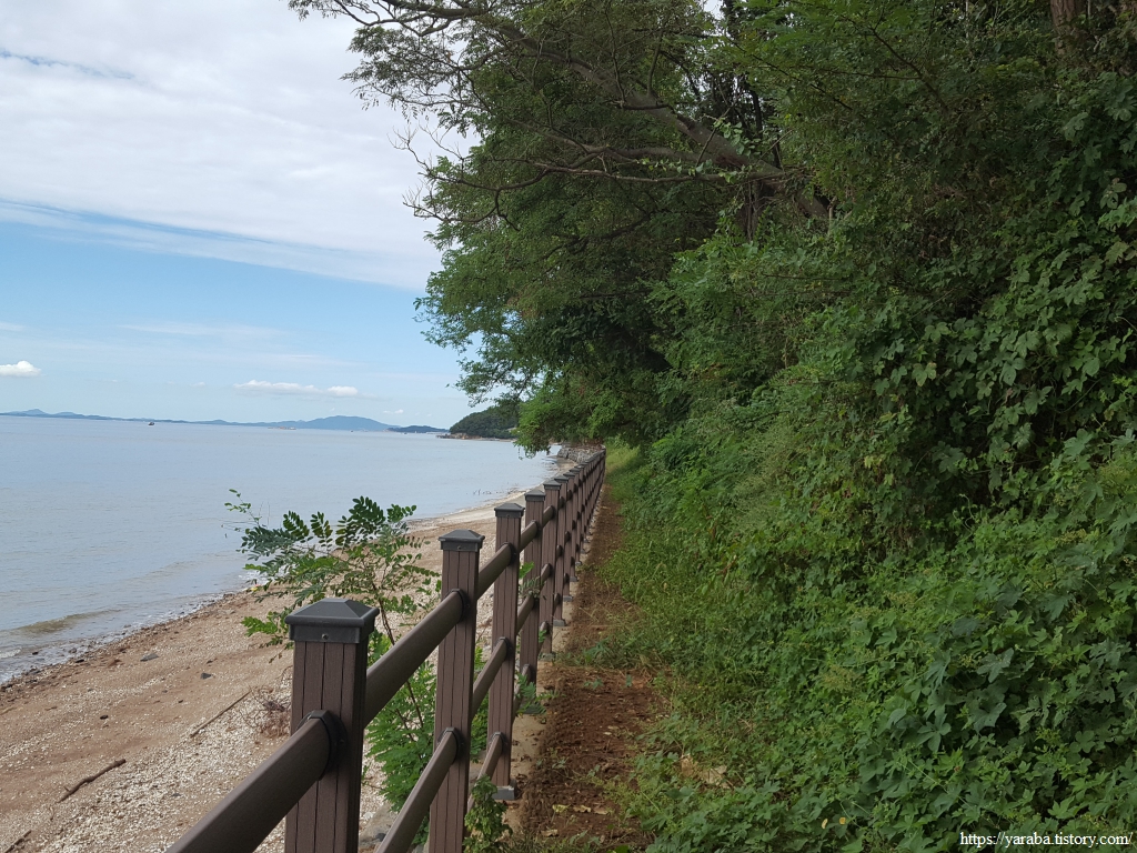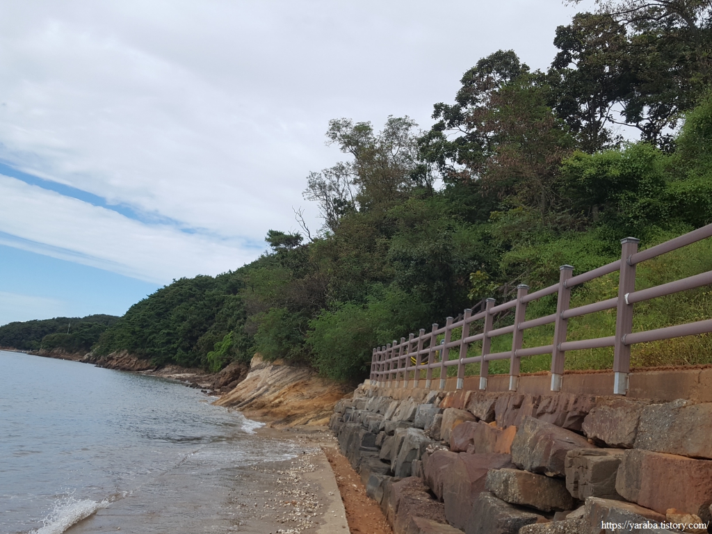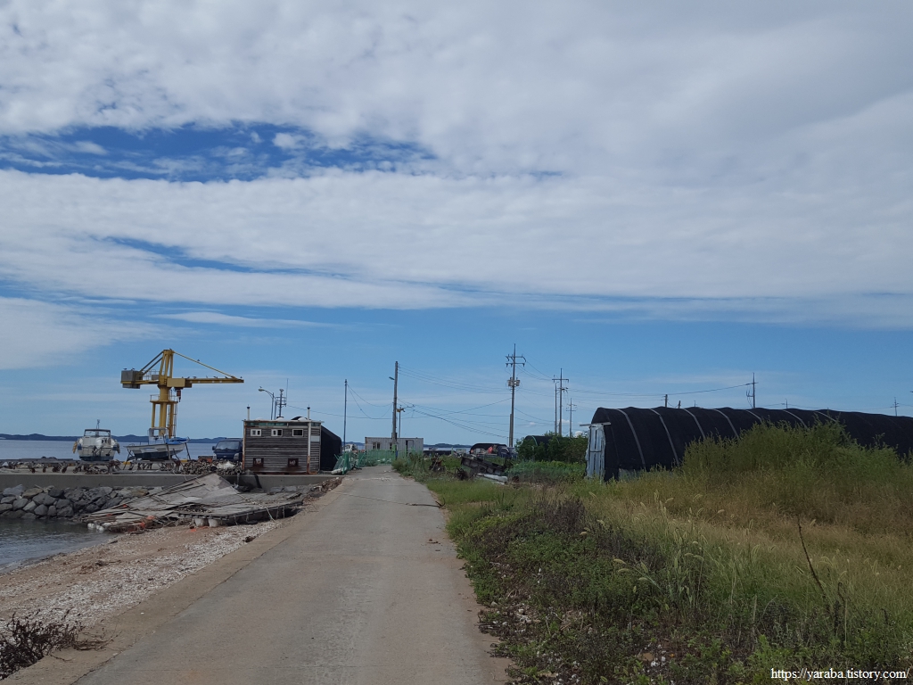 사호 3리 포구 이후의 길이 문제였다. 사실 물이 빠진 상태에서는 난간이 있는 이길로 가지 않고 해안으로 내려가서 걸어도 된다. 해안을 따라서 마을분들이 물이 빠질 때 사용하는 콘크리트 길도 있기 때문이다. 그런데 물때를 전혀 생각하지 않았던 우리는 난간이 있는 길을 걷기 시작했는데 결국 이 길은 잘 정비되지도 않았고 길도 망가져 있는 상태였다.ㅠㅠ
