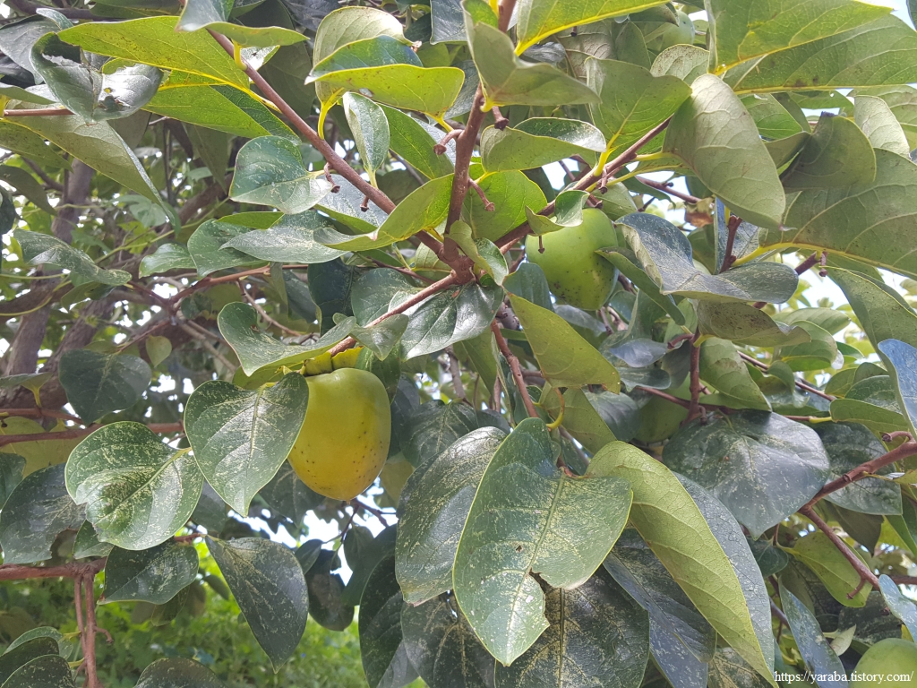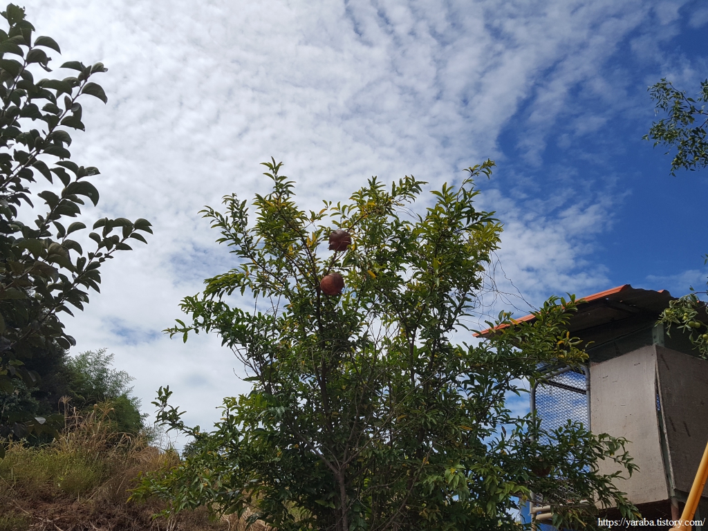 날씨는 그냥 서 있어도 땀이 줄줄 흐르는 34도에 육박하지만, 주위 모습은 가을이다. 벌어진 밤송이도 땅에 떨어지고, 감도 노랗게 익어가고 있고, 석류도 탐스럽게 익었다.