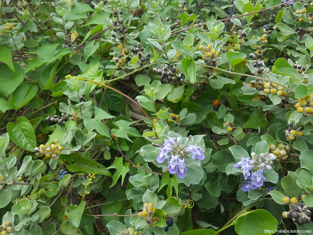 호박벌에 집중하느라 놓칠뻔한 순비기나무의 보라색 꽃도 일품이다. 영롱한 보랏빛이다. 꽃이 지면 검정 열매가 맺히는데 만형자라는 이름의 한약재이다. 식물이라고는 뿌리내리기도 어려운 소금기 많은 땅에서 벌에도 사람에도 유용한 식물이라니 그저 놀라울 뿐이다.