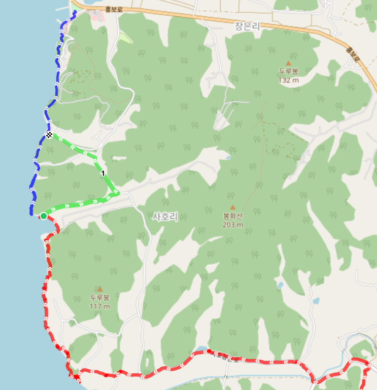 보령 방조제를 지나서 천북면 하만리의 두룽개길을 걷고 있는 서해랑길은 국도를 가로질러 하만 4리를 지나면서 천북면 사호리로 접어든다. 사호 교차로부터는 사호장은로 도로를 따라서 해안으로 나간다. 해안으로 나온 길은 해안선을 따라 북쪽으로 이동하는데 물이 빠진 간조시에는 별 문제가 없지만 만조시에는 길이 막히므로 이 구간은 반드시 물때를 확인하고 가야 한다. 가족과 함께 이동했던 필자의 경우에도 중간 지점까지는 망가진 산책로를 뚫고 겨우 겨우 이동할 수 있었지만 이후로는 만조로 길이 막혀 아예 갈 수가 없었다. 만조시에 갈 수밖에 없다면 사호 3리부터 중간길로 우회하는 것이 적절하고 중간지점까지 이동해서 길을 막혔다면 녹색 경로로 우회할 수 있다. 길은 사호리를 지나서 천북 굴단지가 있는 장은리에서 여정을 마무리한다.
