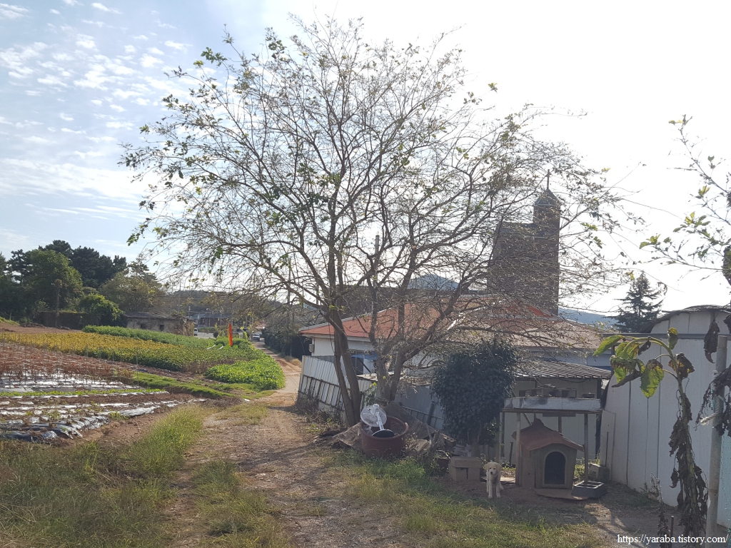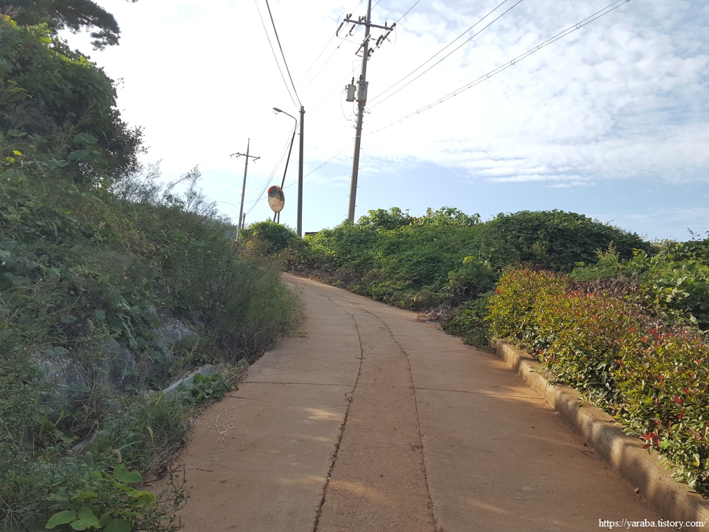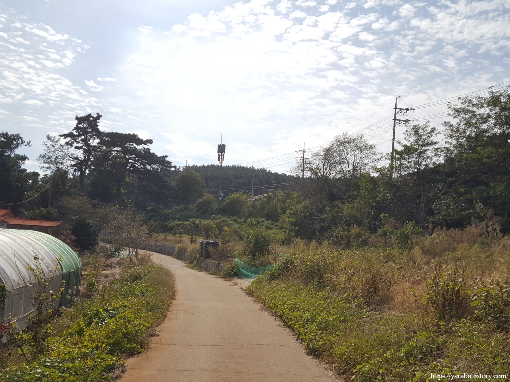 종점을 4.8Km 정도 남겨둔 지점, 용남로 도로를 가로질러 마을길 걷기를 이어간다.