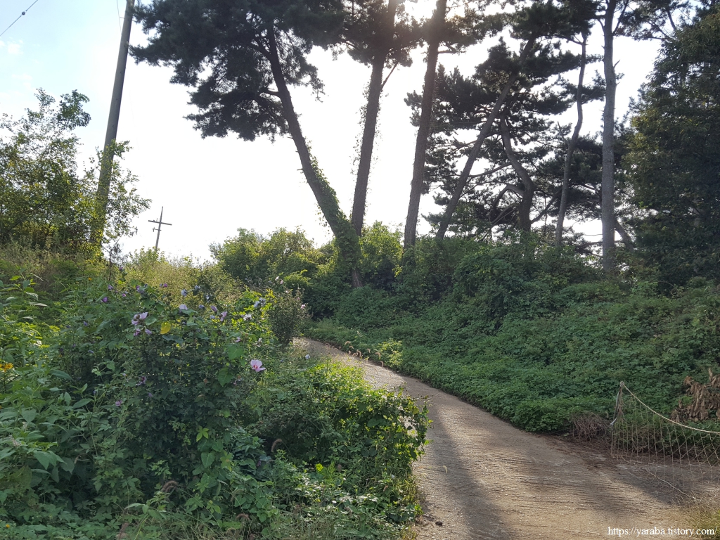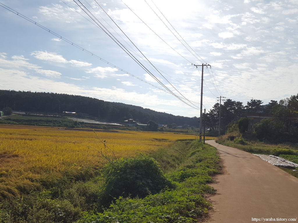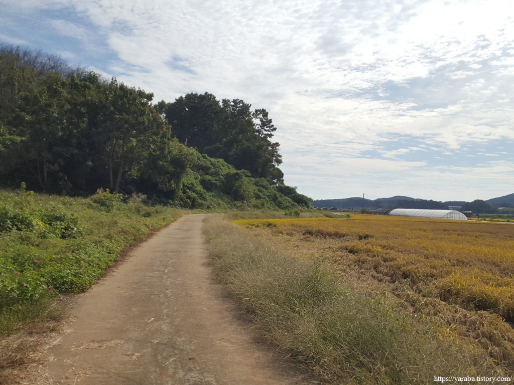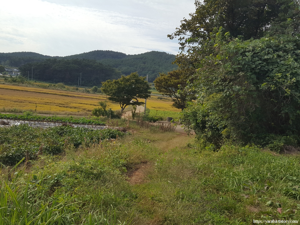 농로를 따라가는 길에서 갑자기 포장길이 없어지고 풀숲으로 들어가니 당황스러웠지만, 서해랑길 리본을 따라 1백 미터의 짧은 오솔길을 지나면 다시 포장길을 만난다.