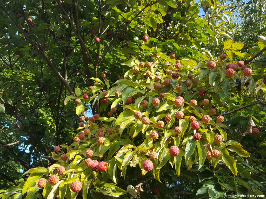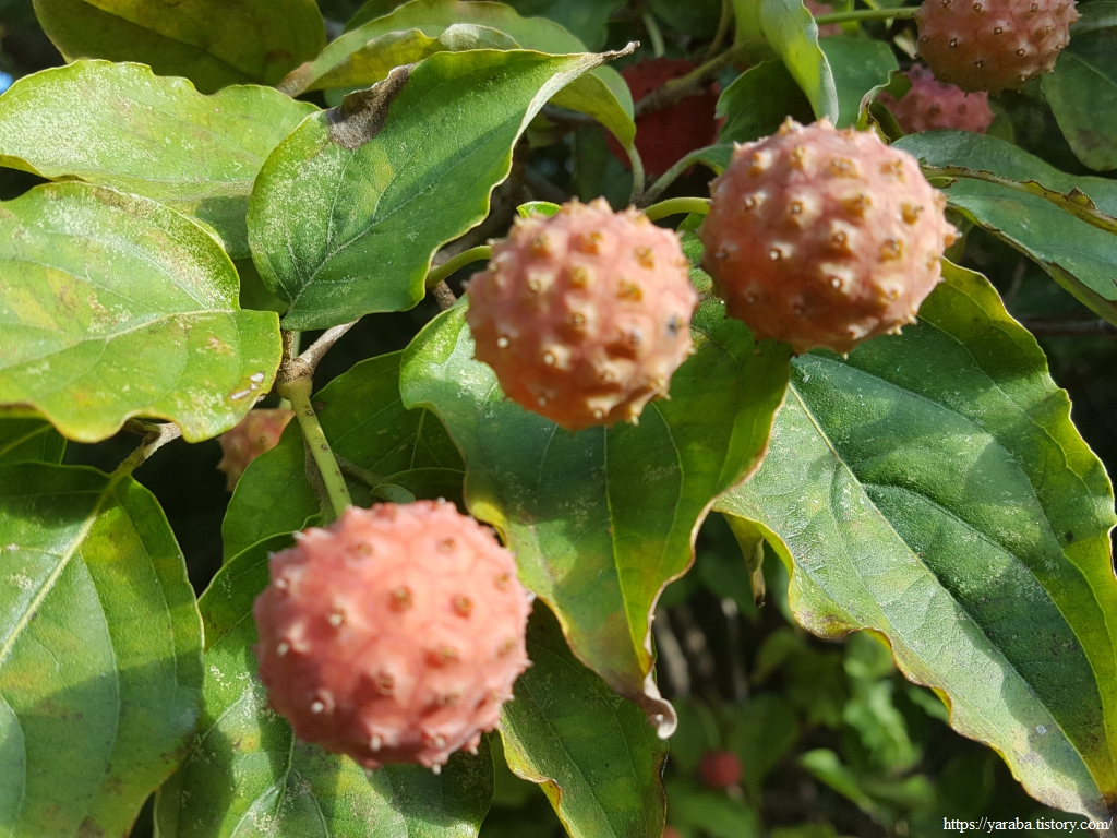 계곡길에서 독특한 모양을 가진 산딸나무를 만났다. 열매가 산딸기를 닮았다고 붙은 이름인데, 혹자는 코로나 19 바이러스를 닮았다는 이야기도 하는데 자세히 보면 그럴 법도 하다. 열매가 예쁜 모양은 아니지만 망고 맛이 난다고도 하고, 달고 신맛이 난다는데 하나 먹어볼걸 그랬다.