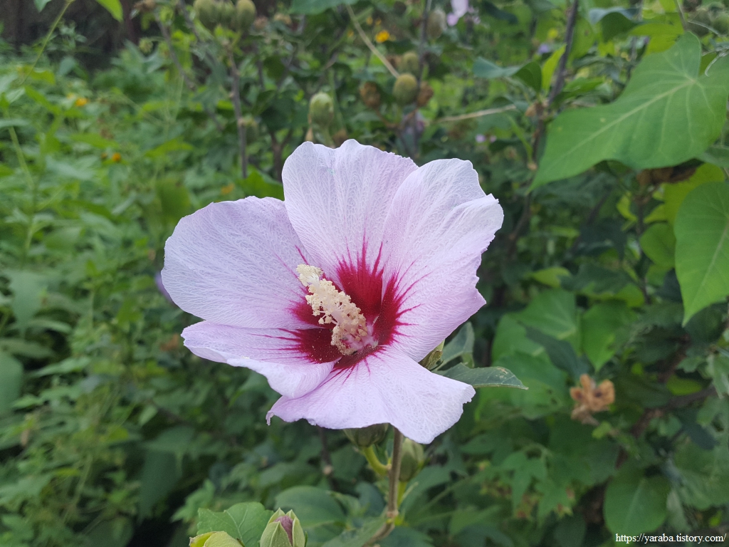 구릉지가 많은 근흥반도길에서 작은 야산의 언덕길들은 걷기의 지루함을 달래주는 묘미이기도 한다. 언덕길에 자리한 무궁화 꽃이 화사하다.