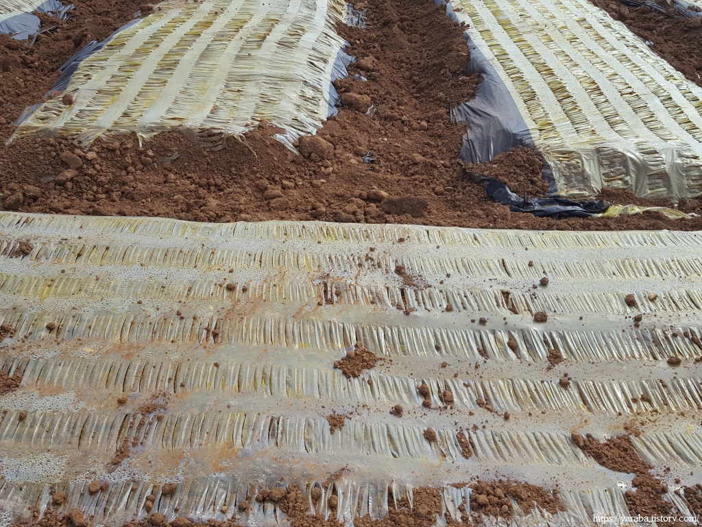 마늘의 고장 태안과 서산을 걷다 보니 새로운 농법도 만나게 된다. 일명 칼집 비닐이라는 것이다. 마늘이 겨울을 나는 작물이니 만큼 한파 대비도 있고 잡초 예방을 위해서 많은 경우 비닐 멀칭을 하는데, 많은 경우 사람이 직접 동그란 구멍이 뚫린 비닐에 맞게 심거나 마늘을 심고 구멍 없는 비닐로 덮었다가 싹이 나면 칼로 구멍을 뚫어주는 방식이었다. 그런데, 이 방식은 마늘 파종기 기계로 마늘을 심은 다음에 칼집 비닐을 덮어주기만 하면 끝인 방식이다. 마늘 싹이 비닐의 칼집 사이로 알아서 나오기 때문이다. 농사 지을 사람이 점점 줄어드는 농촌 현실에서 인력을 줄이는 획기적인 방법이 아닐 수 없다. 발명은 늘 필요를 따라오는 법이다.