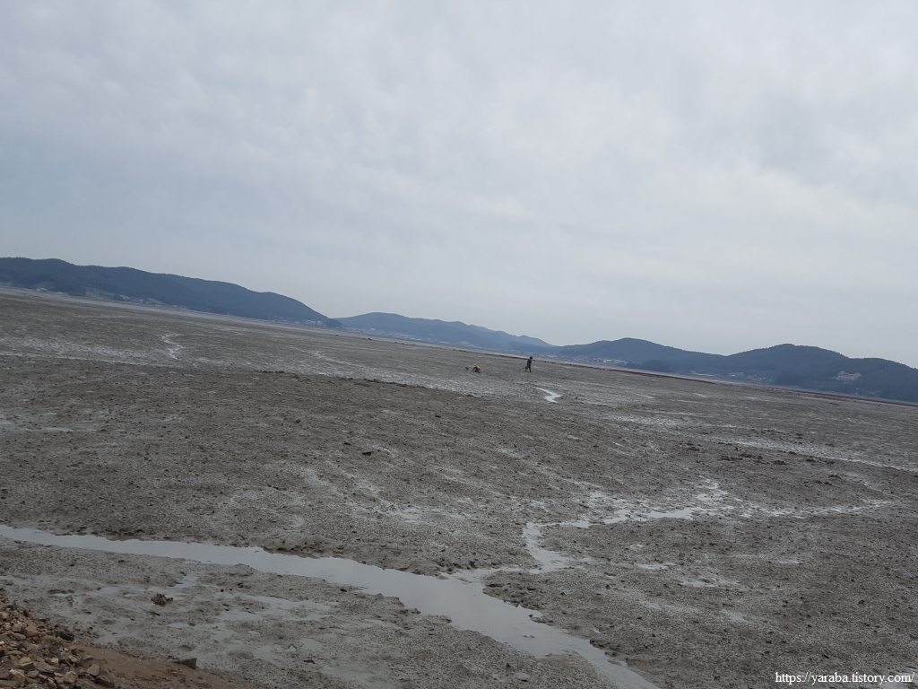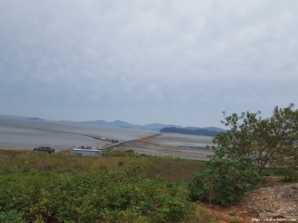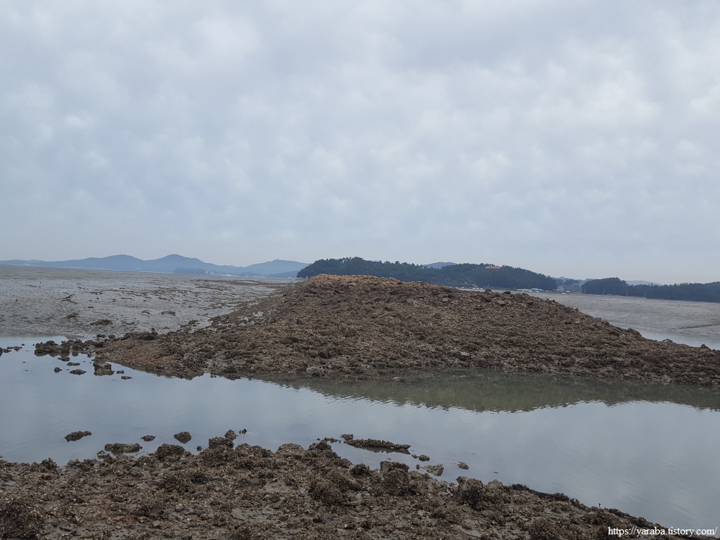 중간에 갯벌에서 일하시는 분에게 바다를 건너갈 수 있냐고 물으니 그럴 거라고 한다. 작업복을 입고 갯벌 속에 있는 사람에게 물었으니 우문현답일 수도 있겠다. 멀리서 보면 둑이 연결된 처럼 보이니 한껏 기대가 부풀렀다.