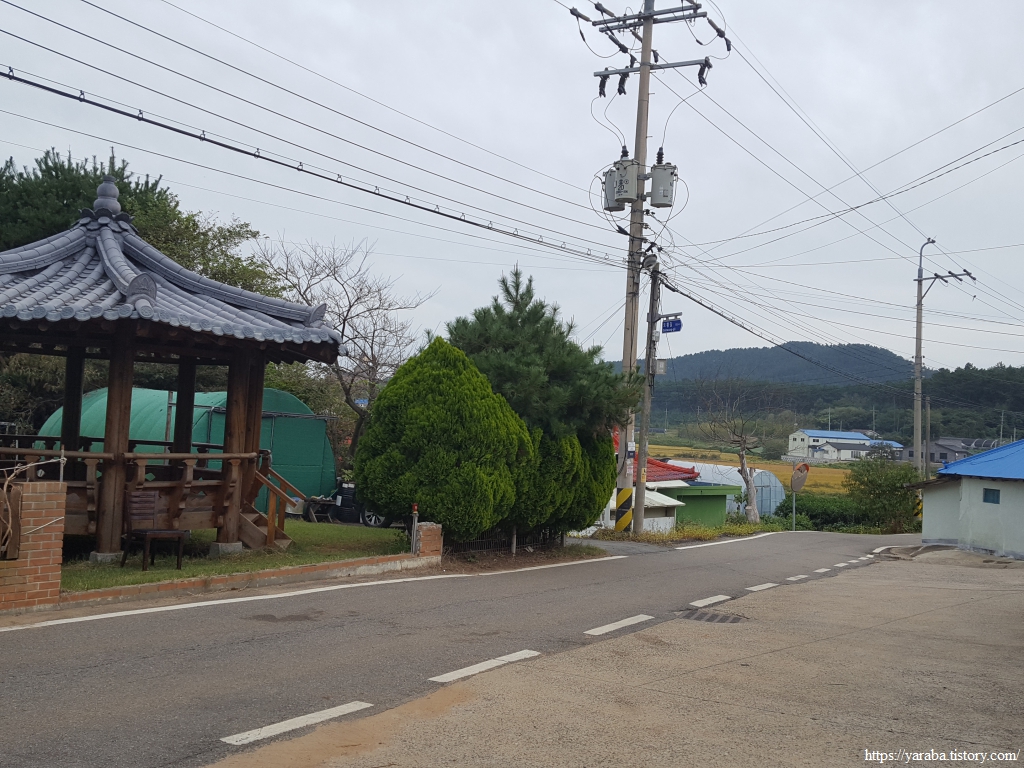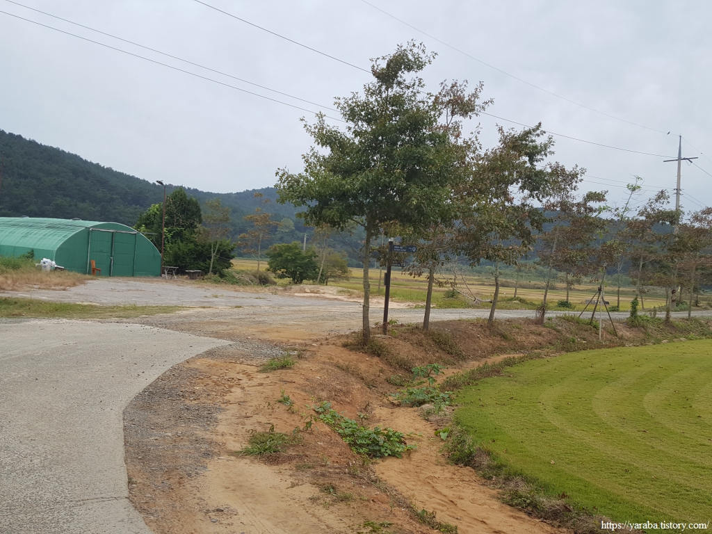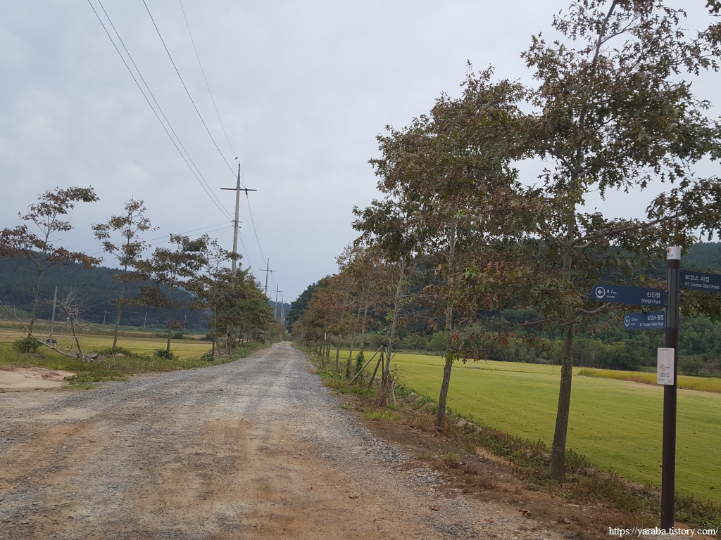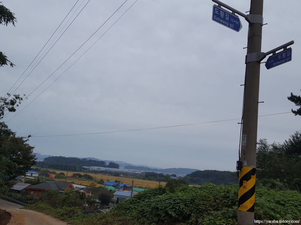 황골 마을을 향해서 가지런하게 심은 가로수길을 따라 서쪽으로 향하던 서해랑길은 황골 마을 앞에서 북쪽으로 방향을 틀어 골짜기 안으로 들어간다.