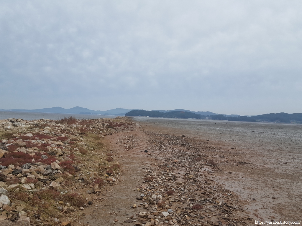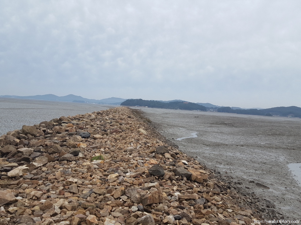 해안으로 내려온 우리는 한참을 망설이다가 원래의 서해랑길인 해안선을 따라 걷는 길 대신에 바다를 가로지르고 있는 둑방길로 가보기로 했다. 사람들이 둑방길을 따라서 왜 들어가고 있는지는 모르겠지만 여러 사람들이 안으로 들어가고 있었다. 최악의 경우 갔던 길을 돌아와야 했지만 그래도 시도해 보기로 했다.