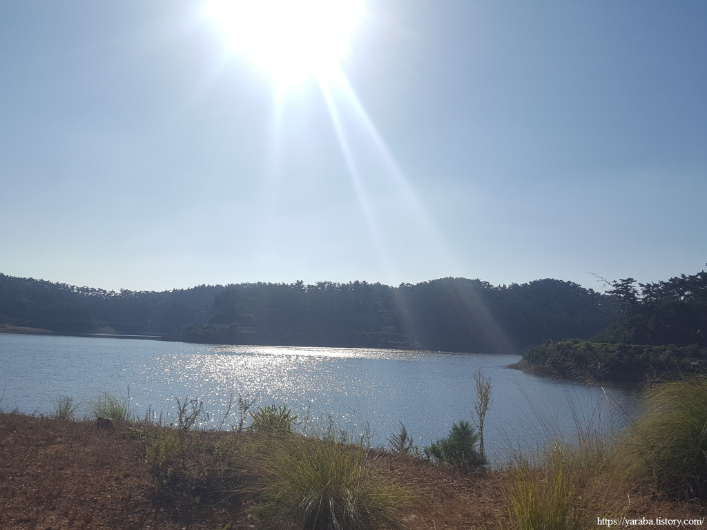 강렬한 오후의 태양이 비추고 있는 모항 저수지를 뒤로하고 모항항을 향해서 북쪽으로 임도를 걸어간다.