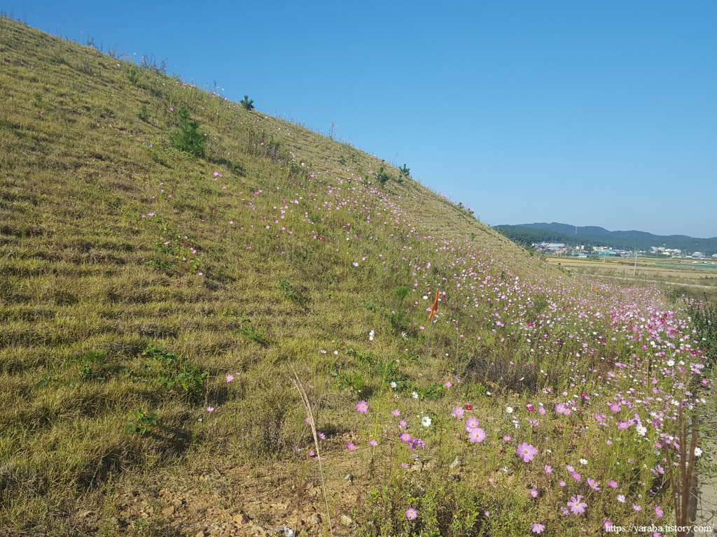 저수지 둑에 피어난 코스모스가 구름 한 점 없는 새파란 하늘과 어우러져 가을색이 완연하다.