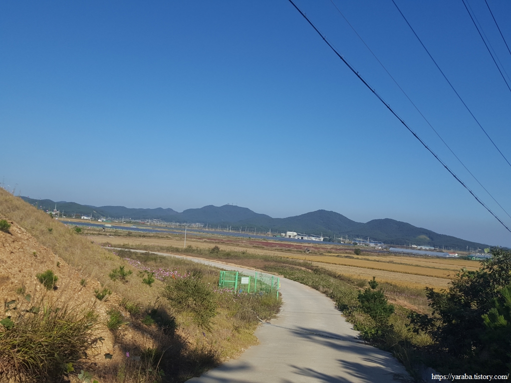 길은 모항 저수지 남쪽으로 진입하여 동쪽으로 돌아서 간다. 길 우측으로는 송현리와 모항리 사이의 바다를 막아서 만든 광활한 농지에서 벼가 황금색으로 익어서 수확을 앞두고 있다.