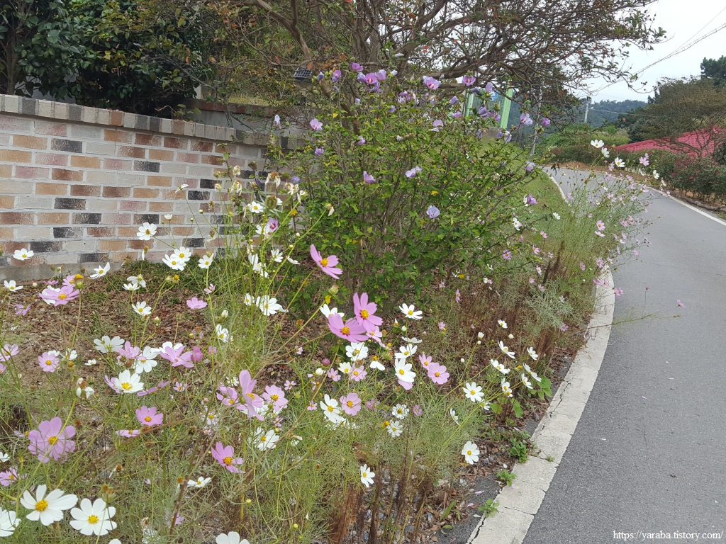 산을 내려온 이후에는 천리포 마을길을 따라 걷는다. 코스모스가 이곳을 처음 찾는 나그네에게 인사를 건네준다.