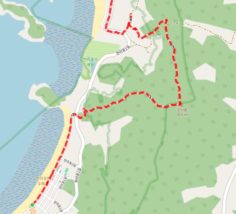만리포에서 하룻밤 휴식을 취한 우리는 만리포 해변을 시작으로 69코스 걷기를 이어간다. 태안군 소원면 모항리에서 의항리로 넘어간다. 해변 끝자락에 이르면 163미터의 국사봉을 넘어 천리포로 향한다. 국립공원 지역이므로 좋은 숲길을 걷는 코스이다. 길은 천리포 해변으로 나가지는 않고 해변 뒤의 마을길을 통해서 북쪽으로 이동한다.