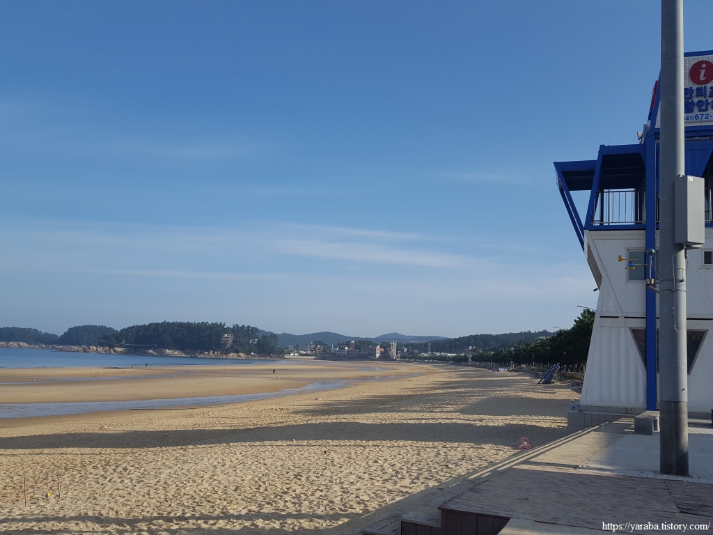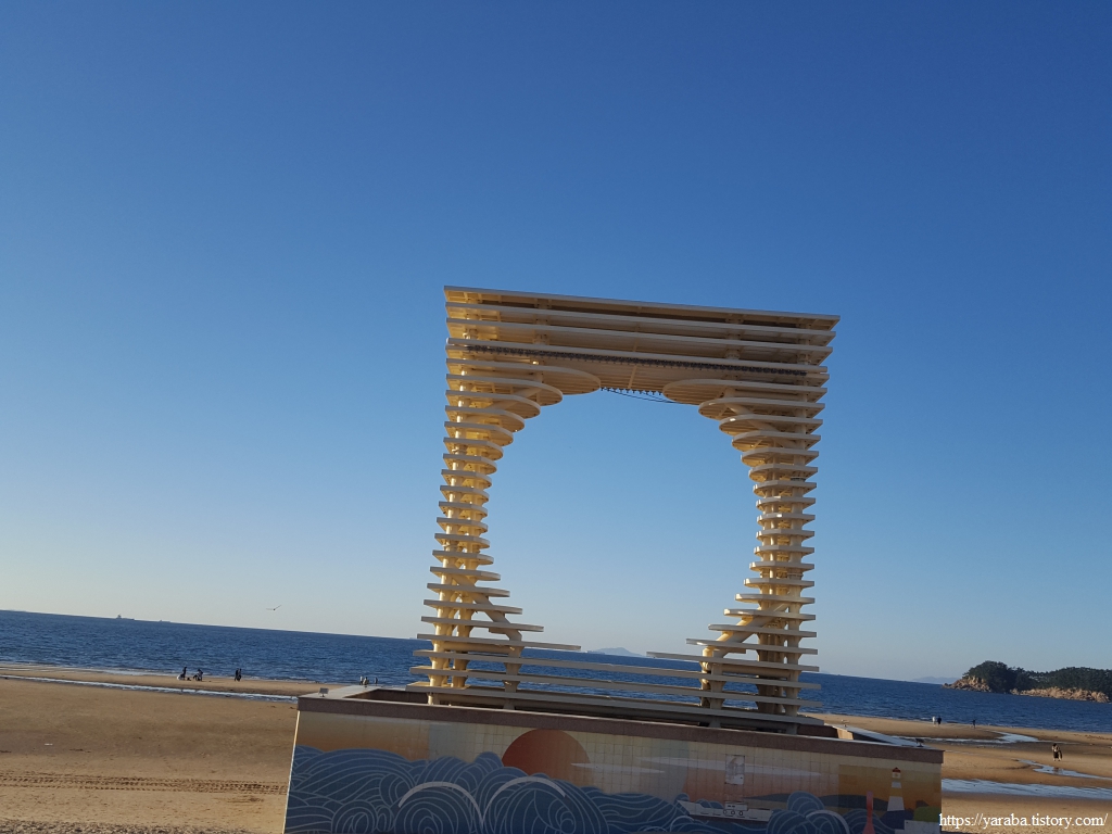 만리포 해수욕장 중앙에 있는 워터 스크린을 보면서 여정을 시작한다. 한 방송사에서 시보 방송을 내보낼 때 카메라는 이 워터 스크린을 관통해서 바다를 조망하는 방식이었다. 만리포를 방문하기 전에는 저게 무엇일까? 하는 호기심만 있었는데 알고 보니 워터 스크린이었던 것이다. 낮에는 그냥 조형물일 뿐이지만 해가 지면 그 진가를 제대로 발휘하는 존재이다.