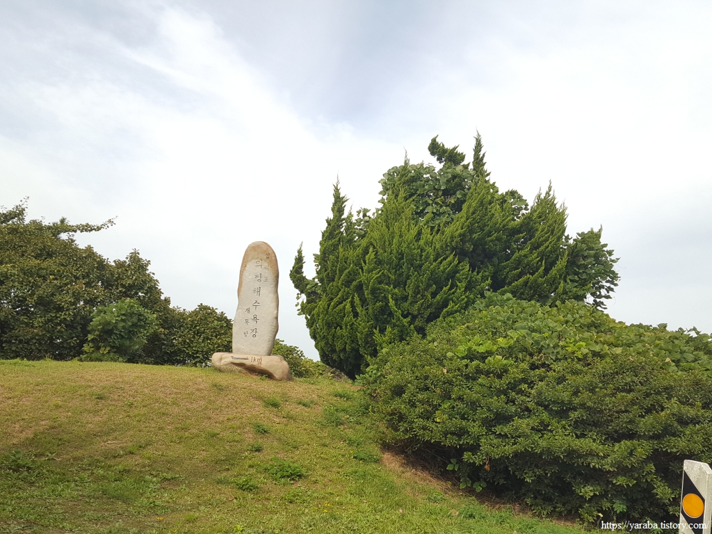 우리는 망산고개에 있는 쉼터에서 잠시 쉬어 가기로 했다. 정자와 벤치가 있는 좋은 쉼터이다. 쉼터에 세워진 의항 해수욕장 옆에는 십리포를 작게 적어 놓았다. 만리포, 천리포, 백리포가 있으니 십리포가 있는 것은 당연한 것 아닌가 싶기도 하다. 도로는 의항 해수욕장으로 바로 이어지지만 서해랑길은 수망산 자락의 숲길을 통해서 의항 해수욕장으로 향한다.