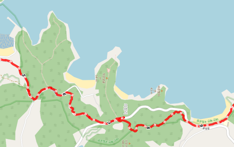 숭의로 도로를 가로질러 의항 해수욕장으로 진입한다. 도로를 따라서 가면 바로 개목항으로 갈 수도 있지만 길은 해수욕장을 따라 북쪽으로 이동하여 구름포와 태배전망대를 돌아서 개목항으로 향한다.
