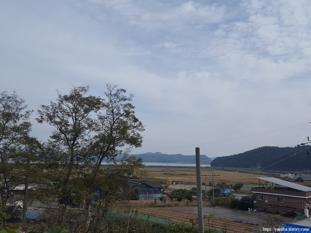 숭의로 도로를 따라서 해변으로 내려오면 우측으로는 의항리의 마을과 간척지 논들이 시야에 들어오기 시작한다. 의항이라는 마을 이름도 개목항이라는 이름도 모두 개미와 연관되어 있다. 지형이 개미허리처럼 잘록하게 생겼다고 붙여진 이름이다. 그렇게 좁은 지형이니 반대편 해안선이 보일 정도이다. 우측의 간척지가 아니라면 양쪽으로 바다를 두고 걷지 않았을까 하는 생각도 든다.