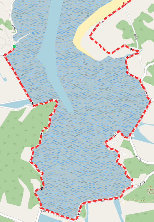 남쪽으로 만리저수지를 보면서 동쪽으로 걸으면 웅도에 닿고 소근진로 도로와 함께 웅도 외곽을 걸으며 소원면 의항리에서 소근리로 진입한다.