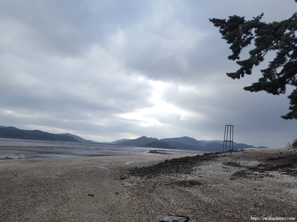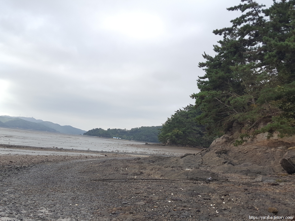 해안 둑방길 끝자락의 의항각지 저수지를 지나면 원래의 서해랑길은 수망산 자락의 숲길을 통해서 산을 넘어가야 한다. 그런데, 바닷물도 빠진 상태이고 어민들이 갯일을 할 때 사용하는 길도 어느 정도 있을 것 같아서 우리는 산 아래의 해안길을 따라서 걷기로 했다. 근소만을 지날 때처럼 갯벌을 횡단하는 것은 아닌 만큼 실패할 확률도 높지 않다는 생각이었다.