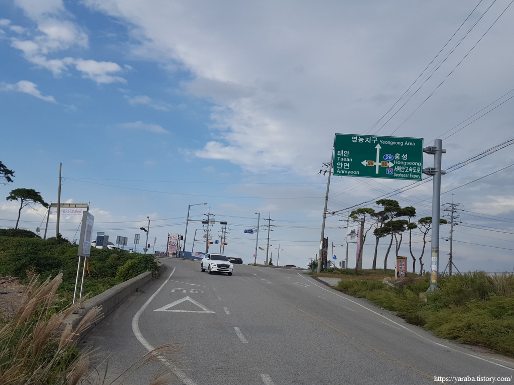 간월, 영농교차로에서 좌회전하여 96번 지방도 천수만로가 지나는 해안 둑방길로 진입한다.