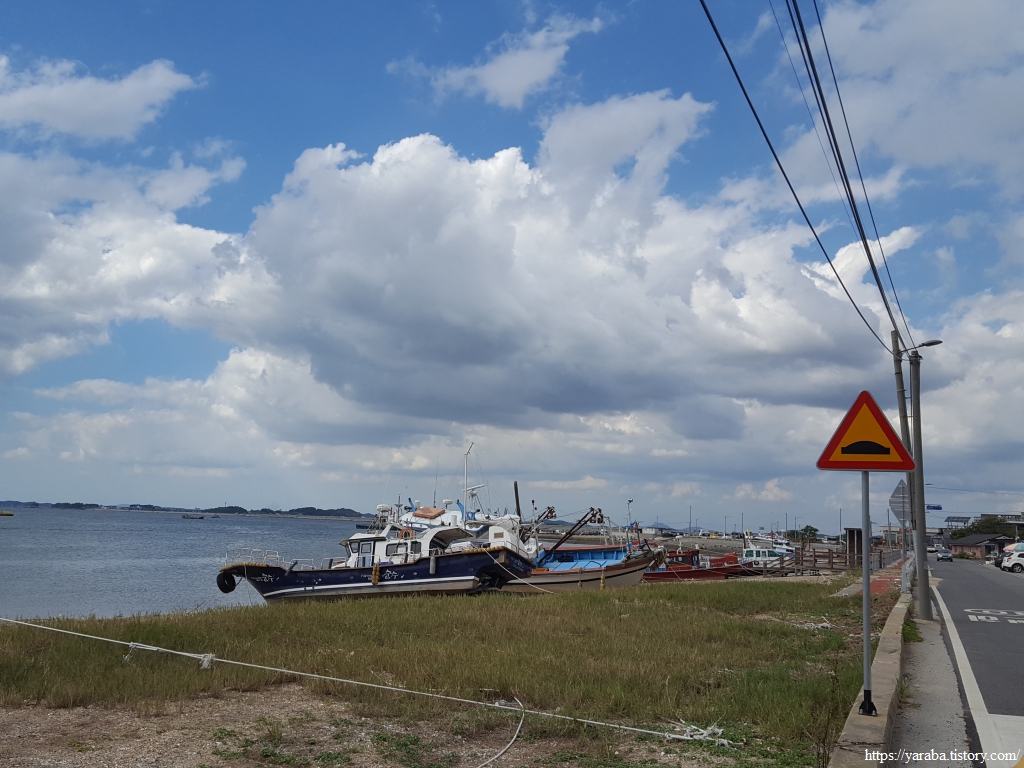 창촌나루터를 거쳐 해안선을 따라 창리포구로 향한다. 앞바다에는 가두리 낚시터들이 가득하다.