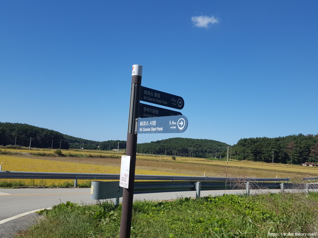 수로를 따라 남쪽으로 내려가던 길은 태안군 공설 영묘전 입구 인근에서 서쪽으로 방향을 잡아 길을 이어간다. 서해랑길 표지판에 생뚱맞게 "쥬라기공원"이 등장했는데 약 2Km 지점에 있는 곳으로 박물관도 운영하고 있다. 50여 개가 넘는 공룡 진품을 보유하고 있다고 한다. 방향은 비슷하지만 서해랑길은 그곳을 들르지 않는다.