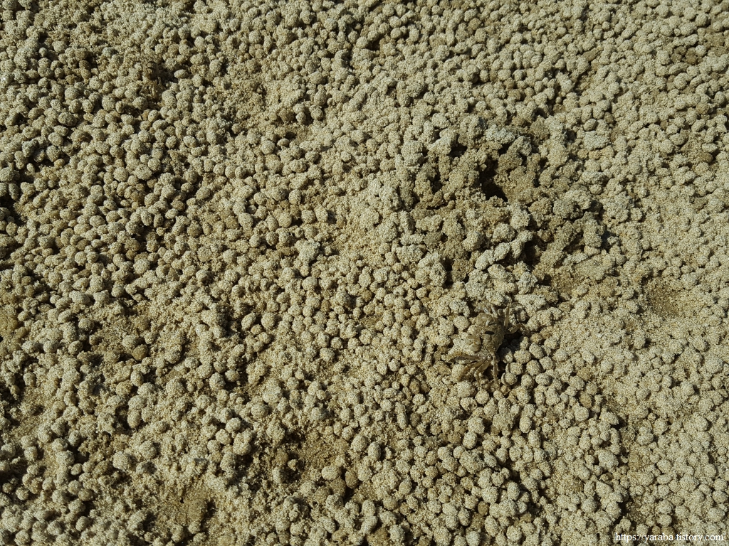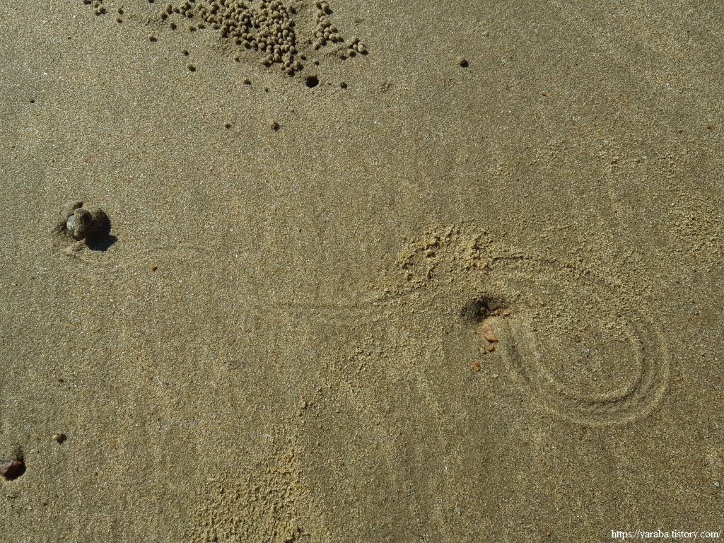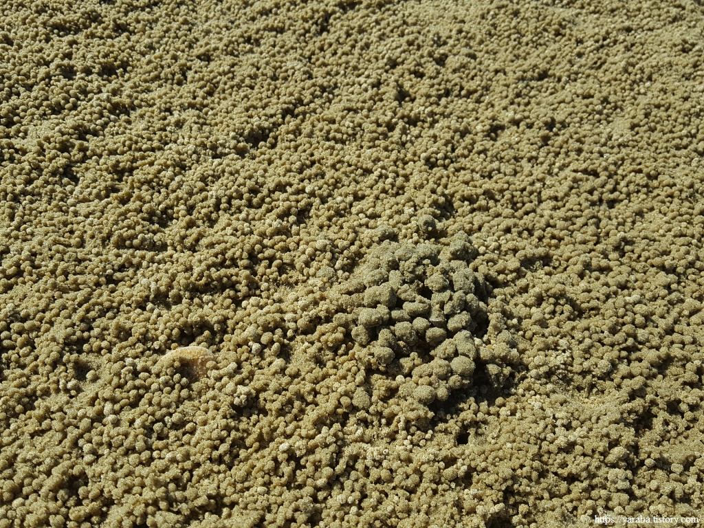 해변의 또 다른 풍경은 수많은 모래경단이었다. 게들이 열심히 먹이활동을 수행한 결과물이다. 모래 속에 있는 플랑크톤이나 유기물을 먹고 모래는 경단으로 만들어 치워 놓은 것이다. 엽낭개 또는 달랑게가 모래를 깨끗하게 만드는 청소부 역할을 하고 있는 것이다.