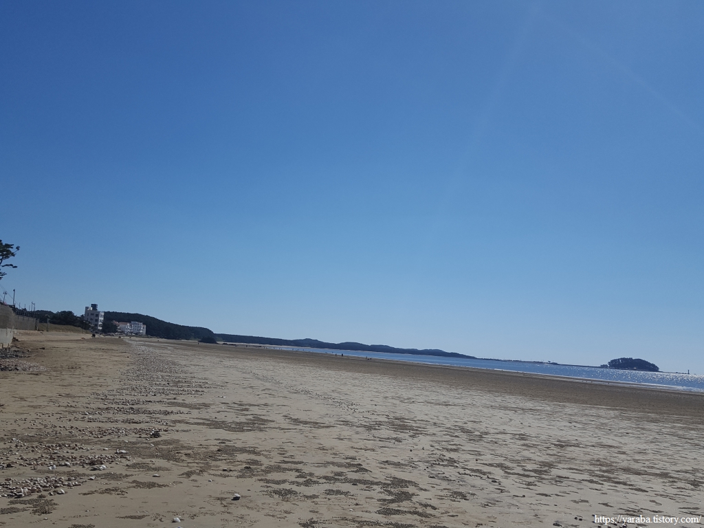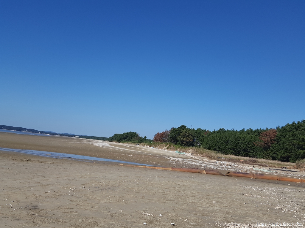 청포대 해수욕장 끝자락에 오니 해변의 본모습을 바라볼 수 있었다. 원래의 서해랑길은 이지점에서 계속 숲길로 들어가서 산책로를 통해 몽산포 해변으로 가지만 우리는 그냥 해변으로 쭉 걸어가 보기로 했다. 썰물 때이기는 했지만 길이 없으면 신발을 벗고 물을 건널 것을 각오했다.