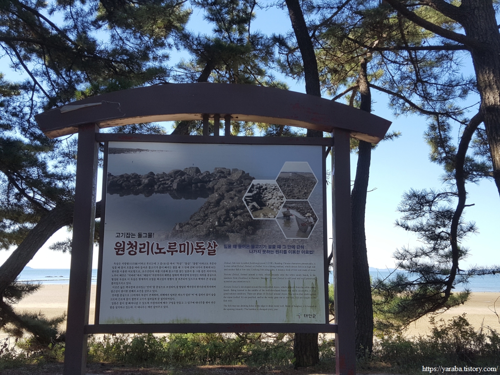 원청리 독살에 대한 안내문. 밀물 때 들어온 물고기가 썰물 때 돌담에 막혀 나가지 못하는 것을 이용하는 어로 방법으로 현재까지도 이 방법으로 계속 고기를 잡고 있다고 한다. 위성사진을 보면 지금도 이곳 해변에 설치된 상당수의 독살을 확인할 수 있다.