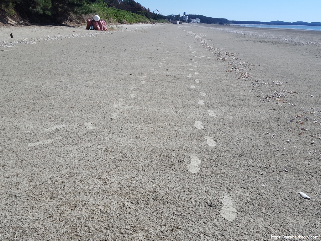 모래경단으로 이루어진 해변을 걸으니 발자국이 더욱 선명하다. 괜스레 미안한 마음이 들어서 걸음도 조심스럽다.
