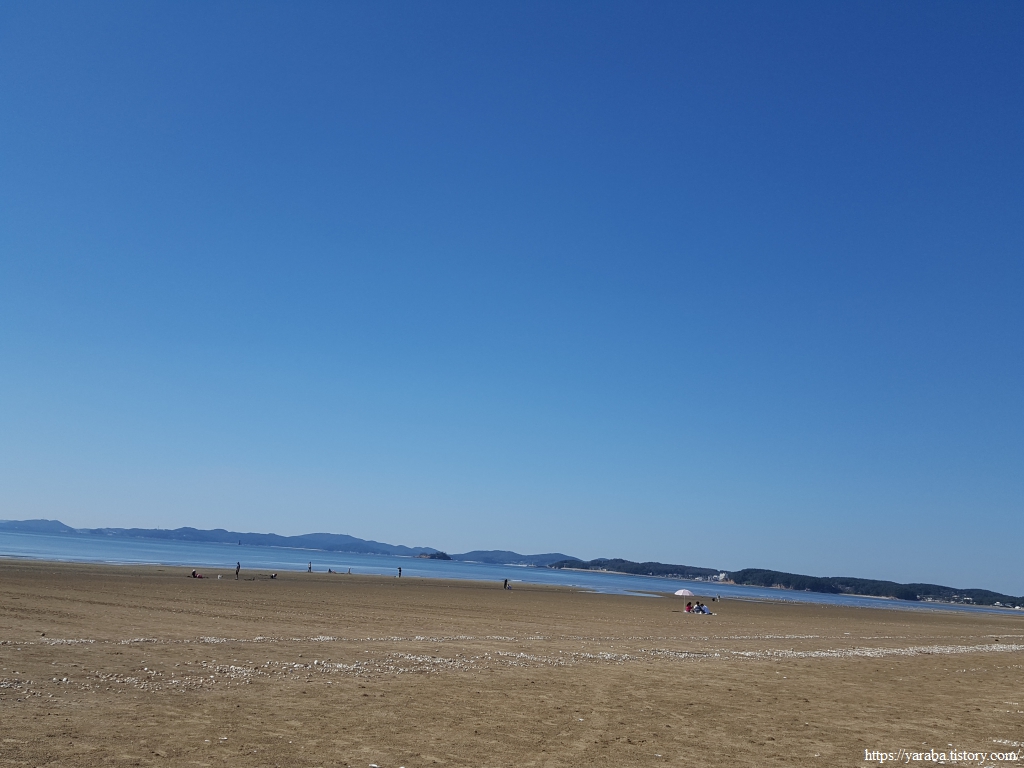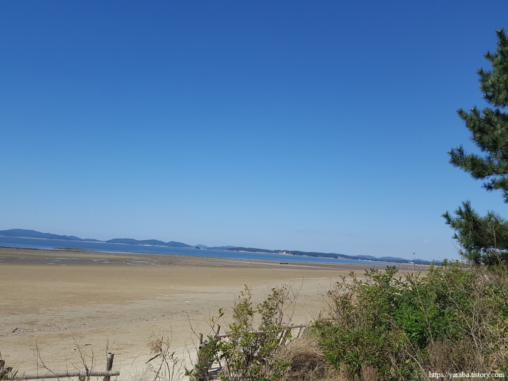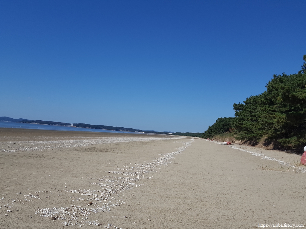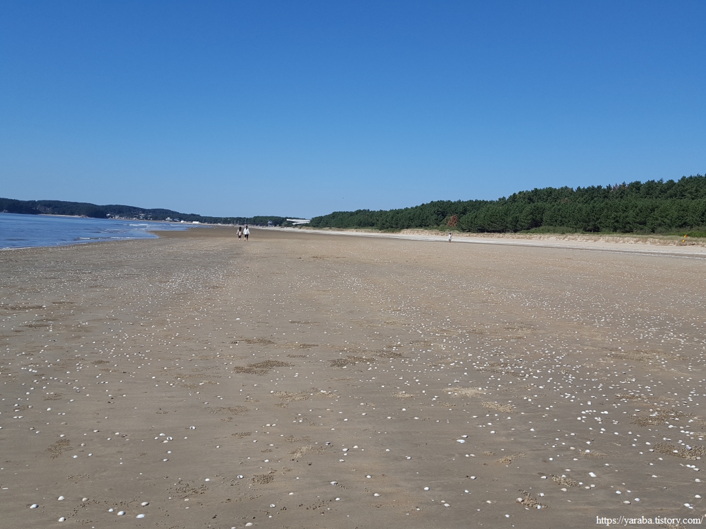 국립공원의 모래사장답게 솔숲 바깥의 해변으로는 깔끔한 모래사장이 광활하게 펼쳐져 있다. 질퍽한 갯벌이 아닌 넓은 백사장을 마주하니 또 다른 느낌이다. 이곳에 "솔모랫길"이라는 이름이 붙은 이유를 알만하다.