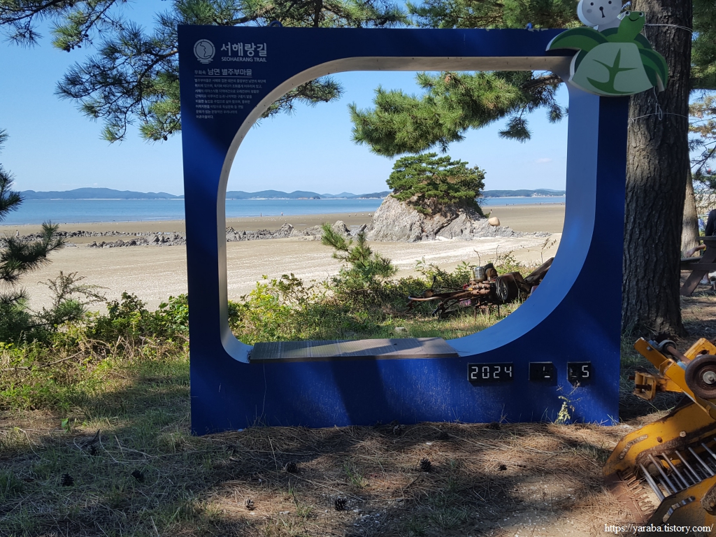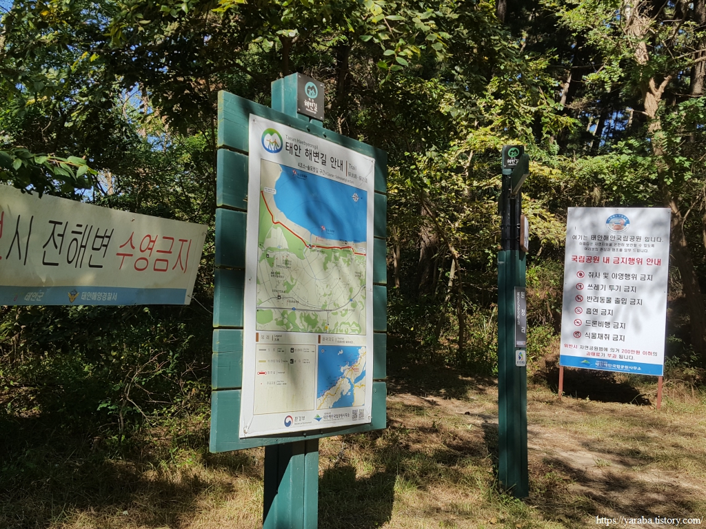 해변 솔숲으로 들러가는 입구에는 태안 해변길 4코스 솔모랫길이라는 표식이 붙어 있다. 태안 해안 국립공원 영역으로 들어온 만큼 깔끔한 산책로를 즐길 수 있다. 서해랑길은 몽산포까지의 솔모랫길뿐만 아니라 파도길, 소원길, 바라길과 함께 한다.