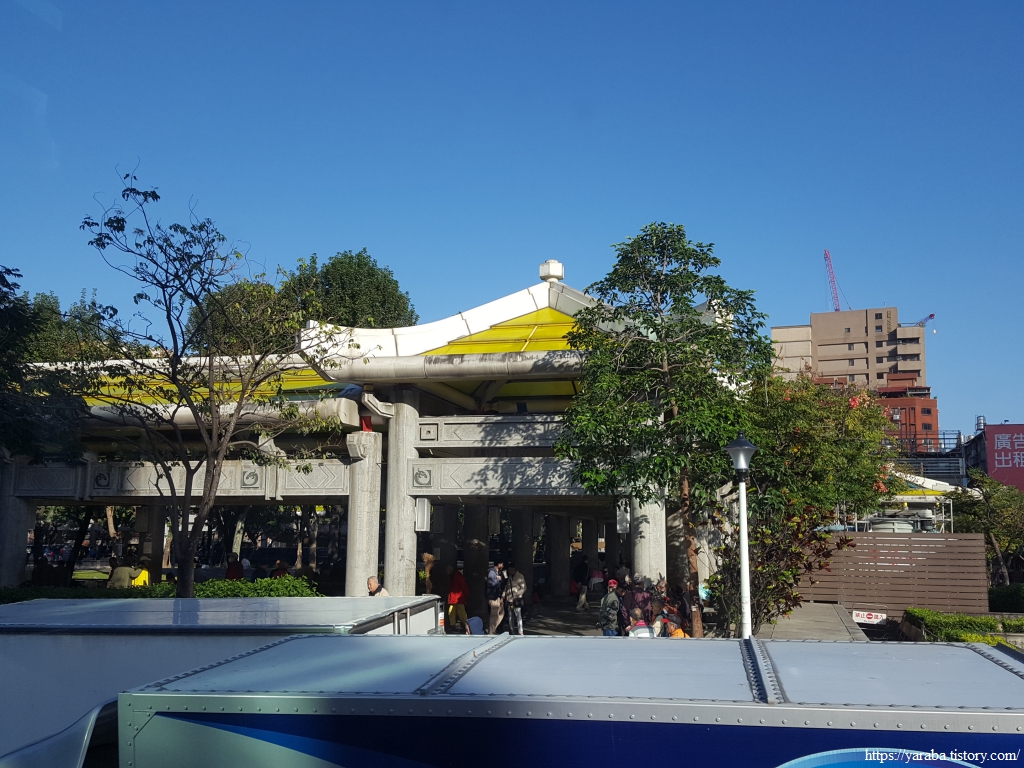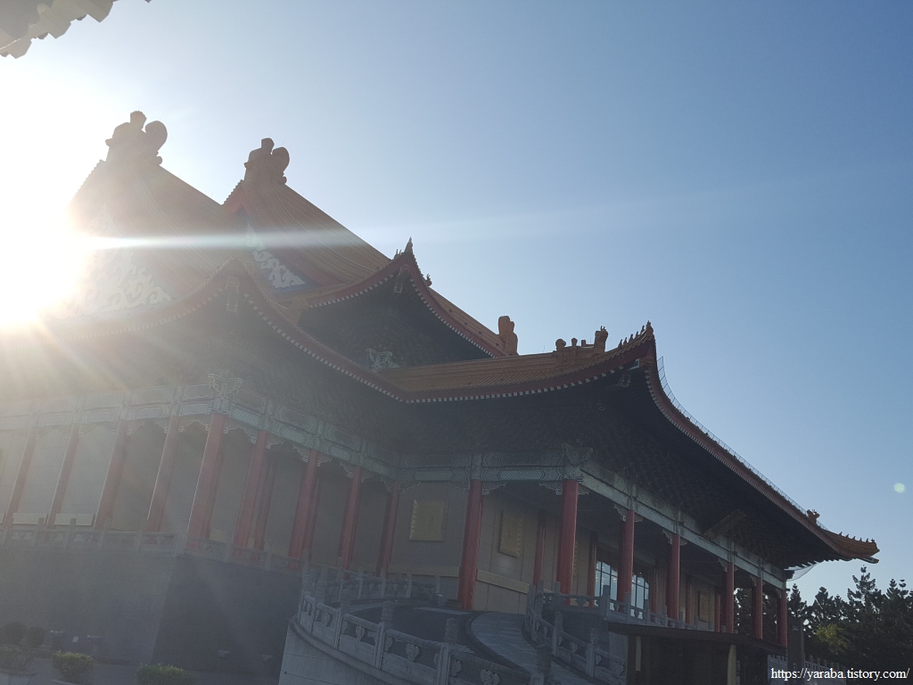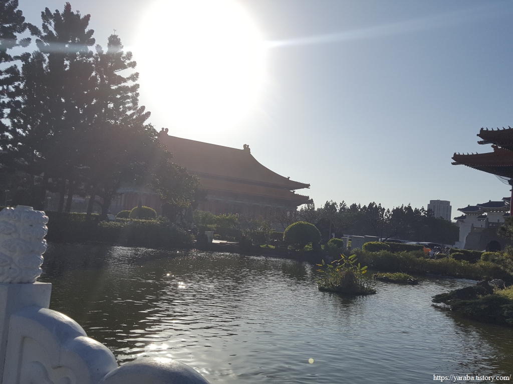 우리는 용산사를 지나서 중정기념관에서 버스를 내려 공원을 걸었다. 입구 쪽에는 거대한 전통 양식의 국가 음악청(國家音樂廳)과 국가 극장(國家戲劇院)이 좌우로 배치되어 있고 그 뒤로 광화지(光華池)와 운한지(雲漢池)라는 연못을 두고 그 뒤로 거대한 중정기념관을 배치한 구조이다.