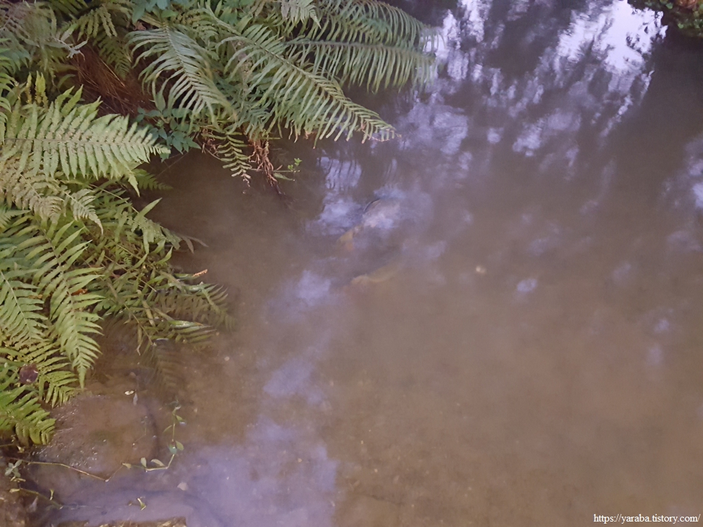 연못에 사는 물고기들이 인기척을 느끼고는 먹이를 주는 줄 알고 우리에게로 몰려든다. 사람이 오면 도망가는 것이 야생의 자연스러운 모습이지만 이곳이 야생이 아님을 물고기들이 말해준다.