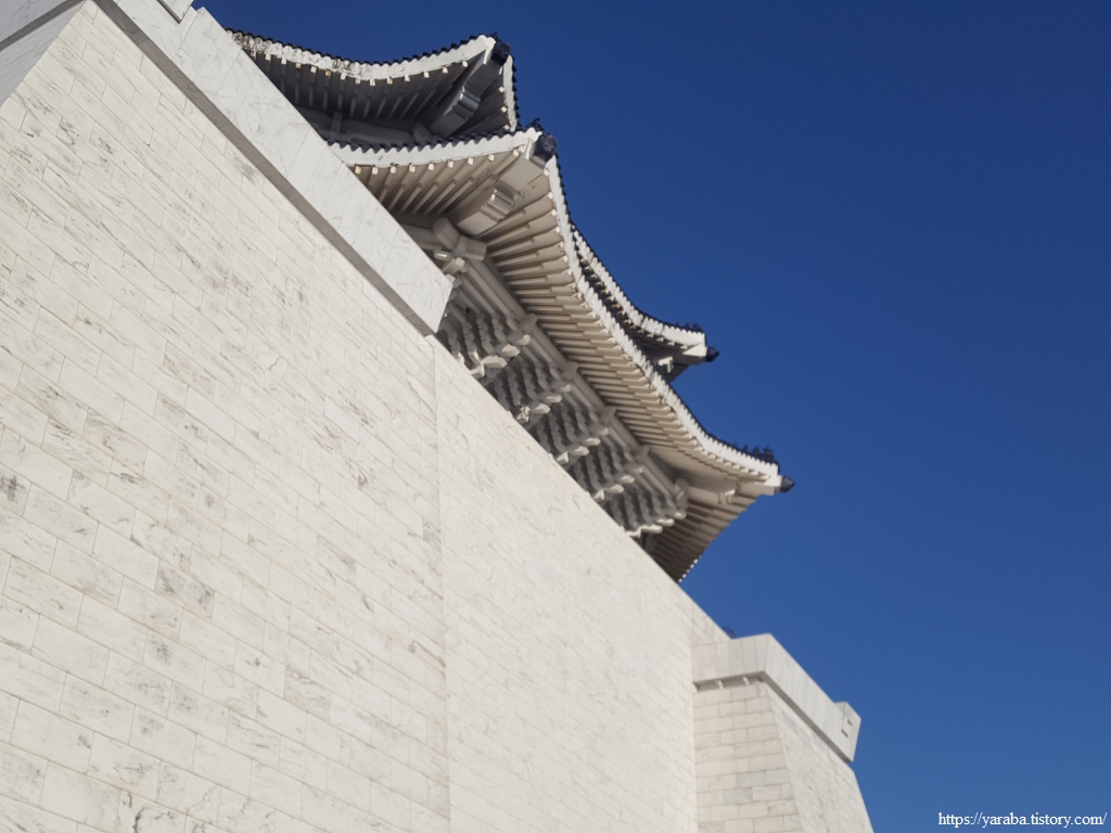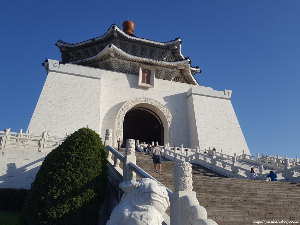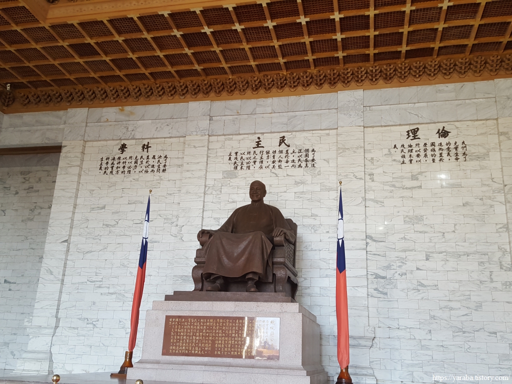 미국의 수도 워싱턴 D.C. 에 있는 링컨 기념관을 본떠서 만들었다고 하는데 비슷한 듯하면서도 다르다. 아무튼 이곳은 장제스, 장개석을 기념하는 공간이다. 그의 본명이 장중정(蔣中正)이라고 한다. 그의 동상 뒤에 있는 문구 윤리(倫理), 민주(民主), 과학(科學)은 각각 민족주의, 민권주의, 민생주의를 의미하는데 그의 스승이었던 쑨원(손문)의 삼민주의와 통한다.