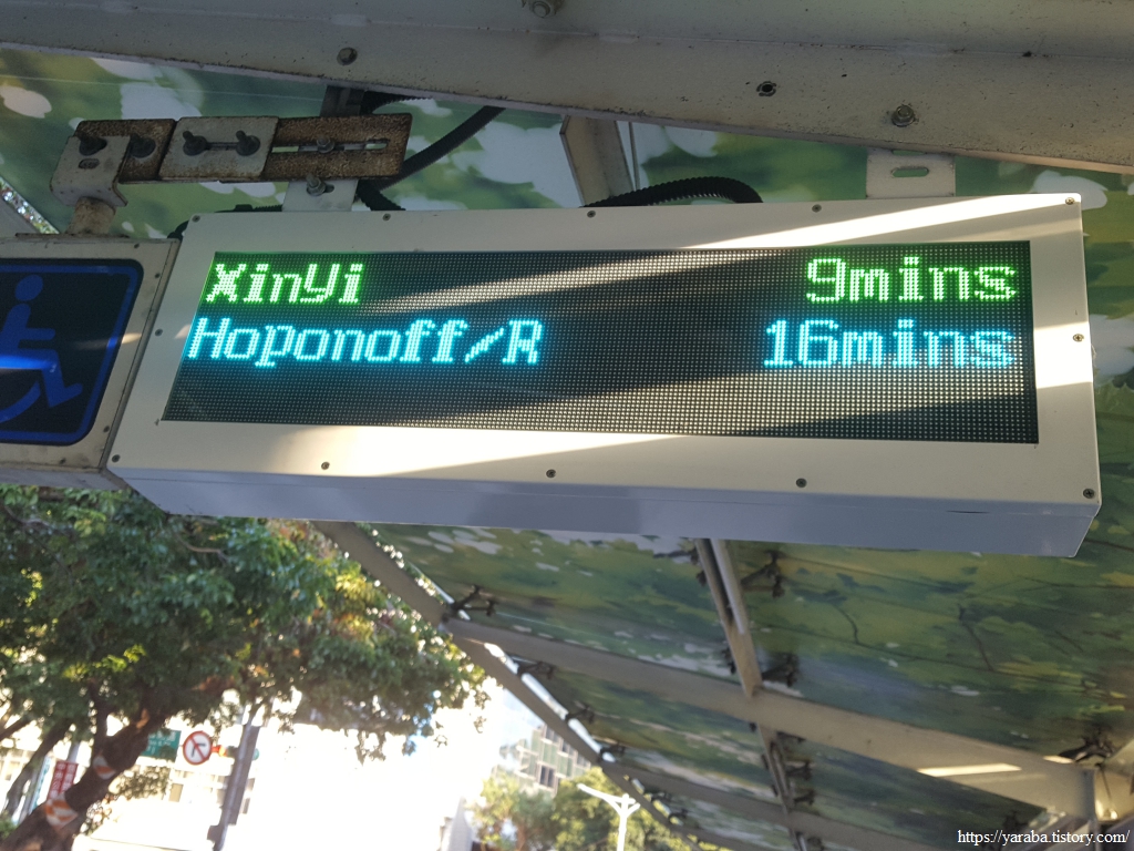 재미있는 것은 일반 노선버스가 아닌 시티투어 버스도 버스 도착 안내 전광판에 도착 예정 시간을 안내하고 있다는 점이었다. 온라인으로도 조회할 수 있으니 와이파이가 되면 대만 여행은 참 편리하다.
