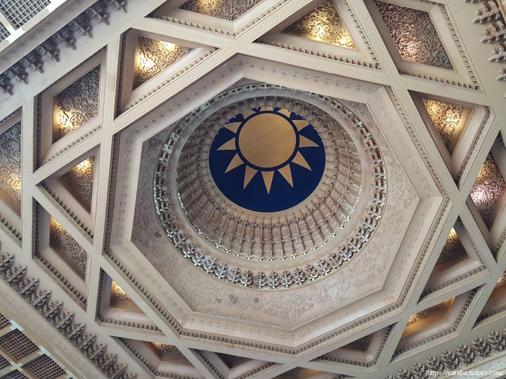 기념관 천장에는 대만 국기에 있는 국민당 로고가 새겨져 있다. 쑨원의 삼민주의를 표현하며 청색, 적색, 흰색을 사용하는 대만 국기는 하나의 중국을 표방하는 중국의 압력 때문에 올림픽에서 사용할 수 없는 것이 대만의 현실이다. 올림픽에서는 매화기를 사용한다.