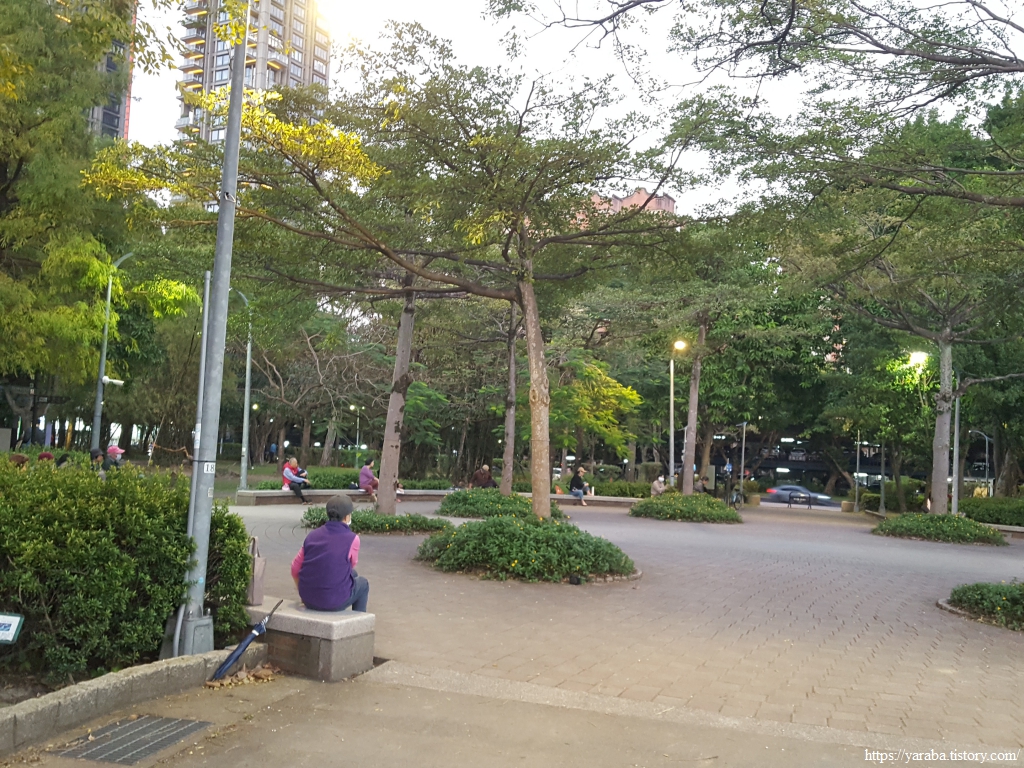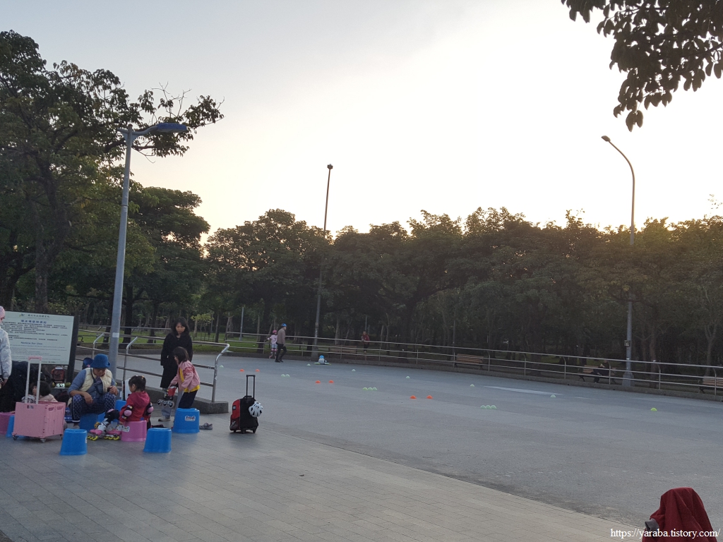 타이베이의 센트럴파크라 불릴 만큼 크고 잘 정비되어 있는 다안산림공원(大安森林公園, Daan Park)에 진입한다. 11월 말이라 조금은 선선하기는 해도 아이들이 인라인을 타고 야외 활동을 하기에는 전혀 부담 없는 날씨이다. 낮에는 화창해서 봄 날씨였는데 오후가 되면서 해가 지기 시작하니 조금은 쌀쌀해졌다. 갓난아이와 나온 부모들, 연인들 다양한 사람들이 도심 속 공원을 즐기고 있다.
