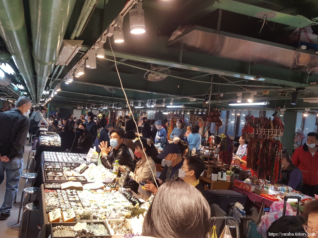 북쪽으로 꽃시장을 구경하며 걸었던 우리는 꽃시장 끝에서 길을 건너서 건국 주말 옥시장(建國假日玉市)으로 넘어간다. 옥시장에 들어서면서 옥장수들의 엄청난 좌판 규모에 놀란다. 엄청난 좌판 규모만큼이나 이곳을 찾는 손님들의 규모도 적지 않다.