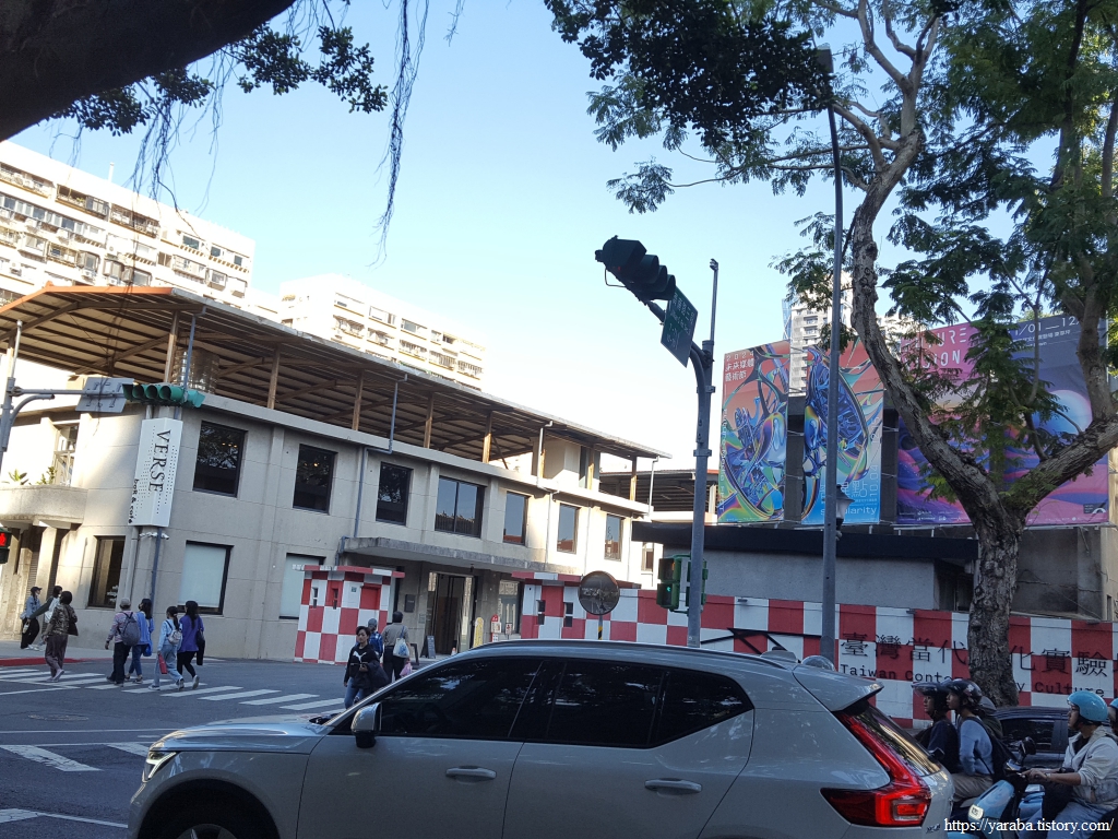 꽃시장과 옥시장을 둘러보느라 지친 우리는 옛 군사시설을 대만 현대 문화 센터(臺灣當代文化實驗場)로 개조한 장소 입구에 있는 카페에 들러 잠시 쉬어 가기로 했다. 담벼락의 체크무늬가 이곳이 이전에는 공군 부대였다는 사실을 일깨워 준다.