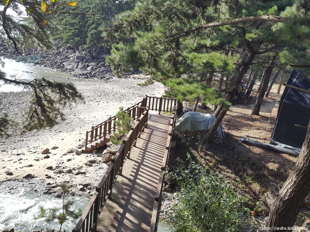 길은 좋은 전망을 선사하는 차돌백이 전망대에 이른다. 계곡 건너편 용난굴 인근의 캠핑장도 시야에 들어온다.