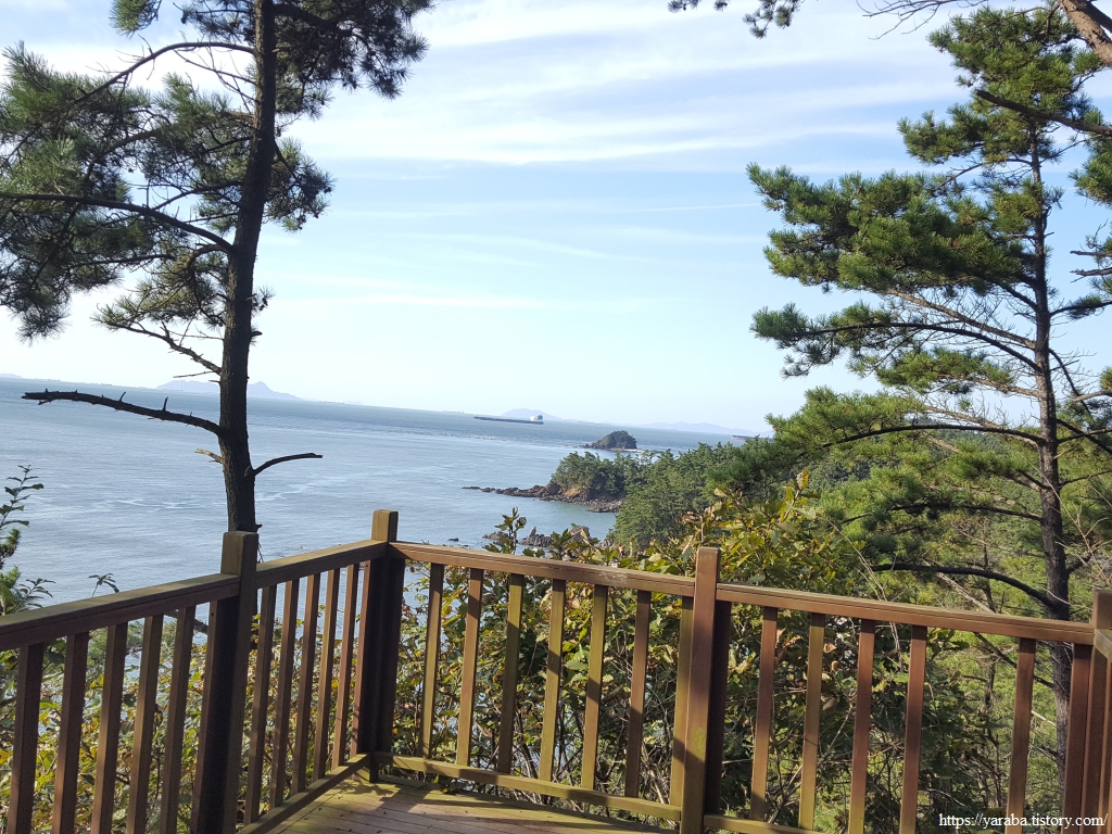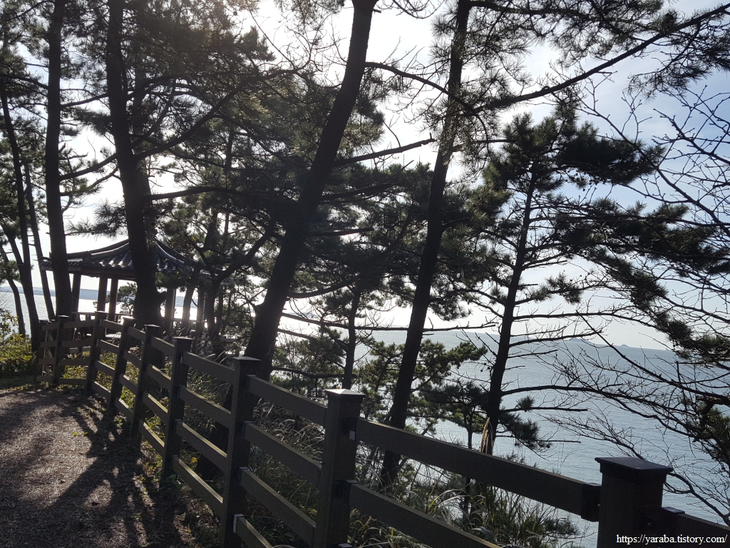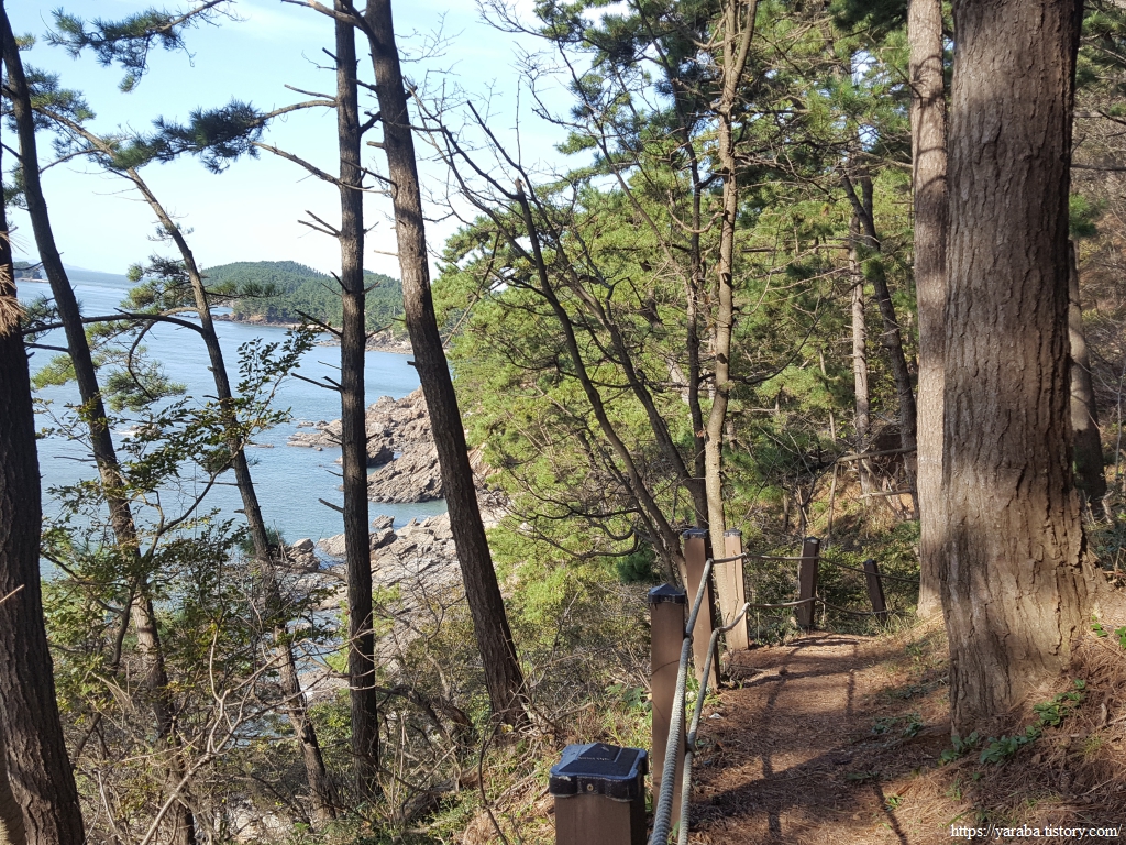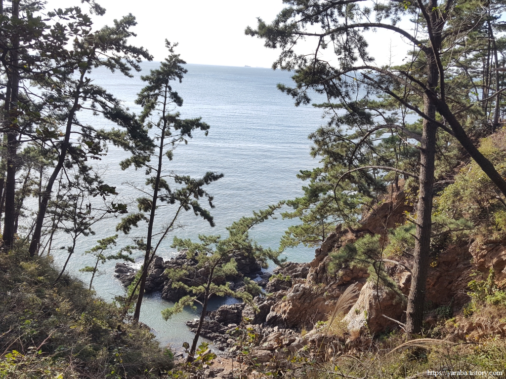 해안 절벽으로 이어지는 솔숲길은 한동안 이어진다. 시야에 들어오는 것은 솔숲과 숲 사이로 들어오는 가을 햇살, 가끔씩 나무 사이로 보이는 바위 해안의 그림이다.