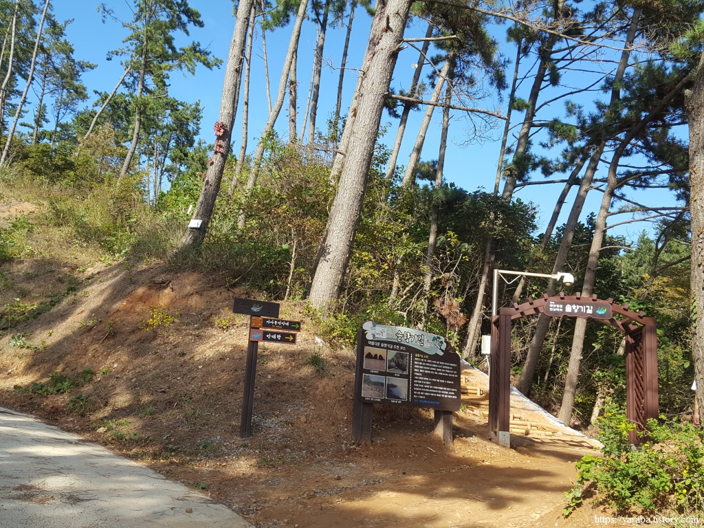 숲길에는 축제 행사의 일부인 "솔향기길 걷기 대회"를 위한 팻말도 세워져 있었다.