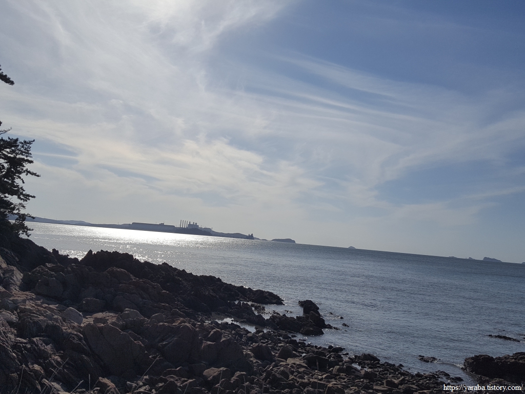 남서쪽으로는 눈부신 오후의 태양 아래 멀리 태안 화력 발전소가 시야에 들어온다. 해안으로 내려왔던 길은 다시 산길을 오르기 시작한다.