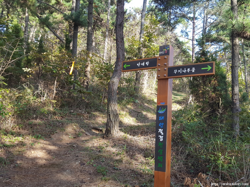 솔향기길 축제로 꾸지나무골 해변은 시끌시끌하다. 축제 현장에 앉아서 흥겹게 축제를 즐길 요량이 아니라면 시끄러운 스피커 소리에서 빨리 벗어나고 싶었다. 태안 절경 천삼백 리 길, 솔향기길 관문이 화려하다. 육골재 자락의 산을 오르는 것으로 72코스를 시작한다. 2007년 원유 유출 사고가 남긴 상처는 120여만 명이 넘는 자원봉사자와 주민들의 수고에 치유되었고 이 솔향기길이 만들어진 것도 사고가 계기가 되었다고 하니 나름 의미가 있는 길을 걷는다.
