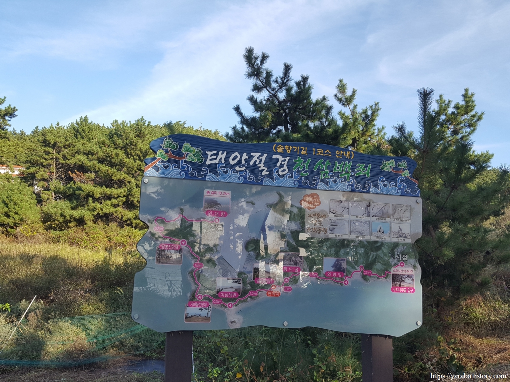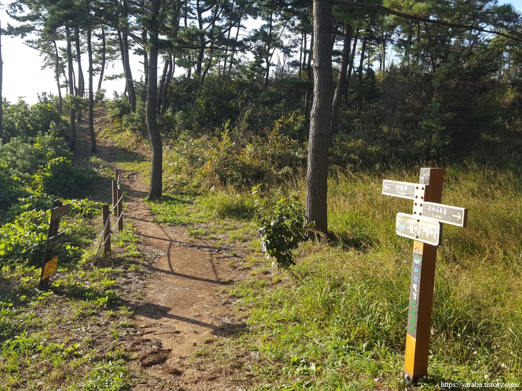 솔향기길의 여러 특징 하나라면 심하다 싶을 정도로 표지판이 많다는 것인데, 아주 친절한 표지판 덕분에 이번 여행에서는 큰 도움을 받았다. 솔향기길은 중간중간에 빠질 수 있는 경로가 존재한다는 것인데 버스길까지 3백 미터라는 정보가 있는 것이다. 때마침 다음 버스 시간도 적당해서 이곳에서 여정을 끝내고 집으로 돌아갔다가 다음 여행 때 남은 길을 걷기로 했다.