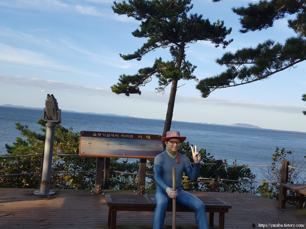 가마봉 전망대에서는 남쪽으로 조금 전에 우리가 지나왔던 여섬도 보이지만 북쪽으로는 울도, 지도, 선갑도, 덕적도처럼 인천시 옹진군에 속해 있는 섬들도 시야에 들어온다. 시야각만 허락하면 인천공항이 있는 영종도도 보이는 것 아닌가 하는 생각도 든다. 이곳에는 솔향기길 1코스를 개척했다는 솔향기길 지킴이 차윤천 님의 인형과 함께 사진도 한컷 남길 수 있다. 한 사람의 열정이 많은 이들에게 유익을 끼치고 있다는 것에 감사하며 마음에 그분의 생각을 담아본다.