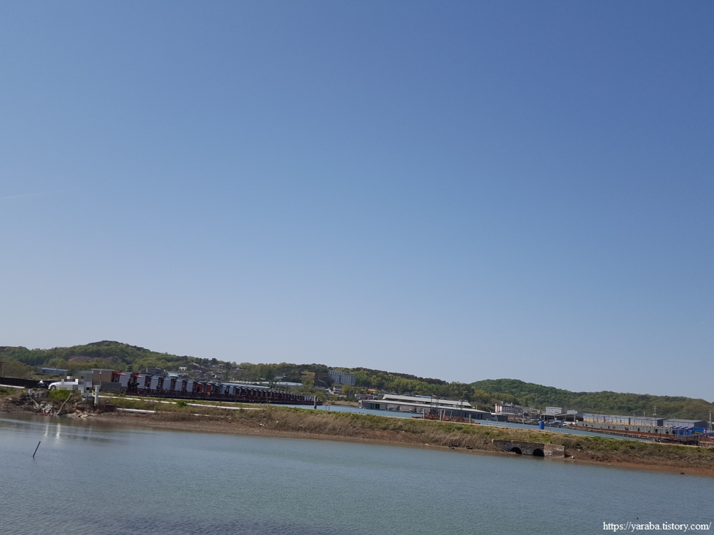 만 안쪽을 동쪽으로 돌아온 길은 배수 갑문을 지나며 남쪽으로 내려간다.