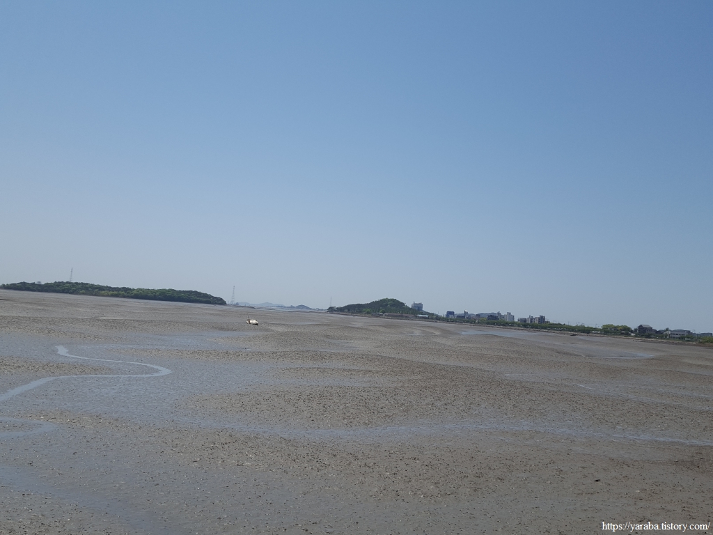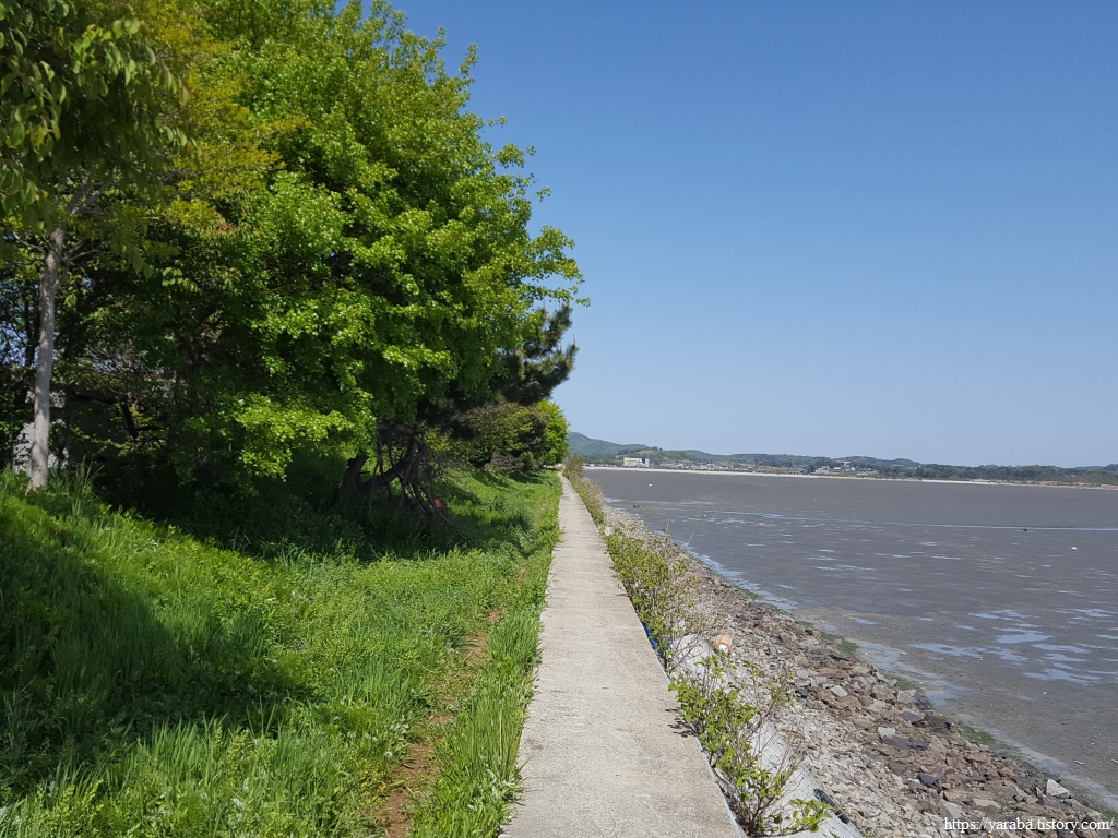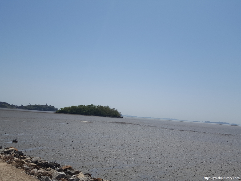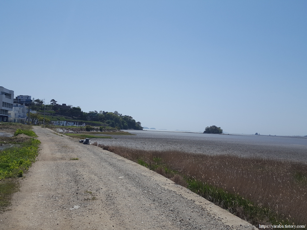 남쪽으로 물 빠진 갯벌과 안고렴섬을 보면서 길을 이어간다.