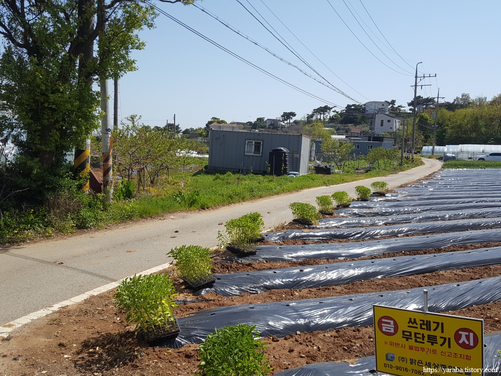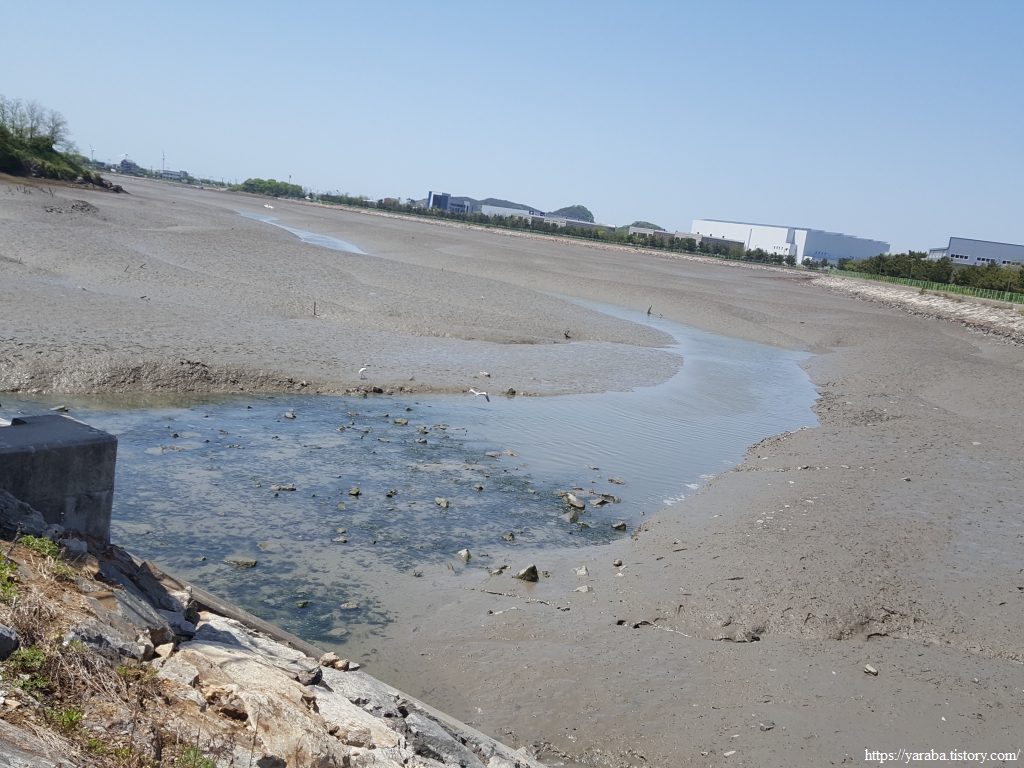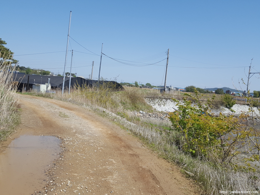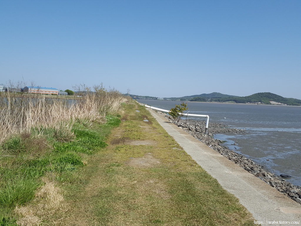 양식장 아래를 지난 길은 이어서 화남 일반 산업단지 아래의 해안 둑방길을 걷는다. 이 길은 둑방길 곳곳에서 봄쑥을 뜯으러 나온 사람들을 자주 만난 길이기도 하다. 봄쑥이 몸에 좋고, 피도 맑게 하고 혈관 건강에도 좋다고 하지만 안전하게 채취할 수 있는 곳에서 뜯어야 할 텐데 하는 염려도 생긴다.